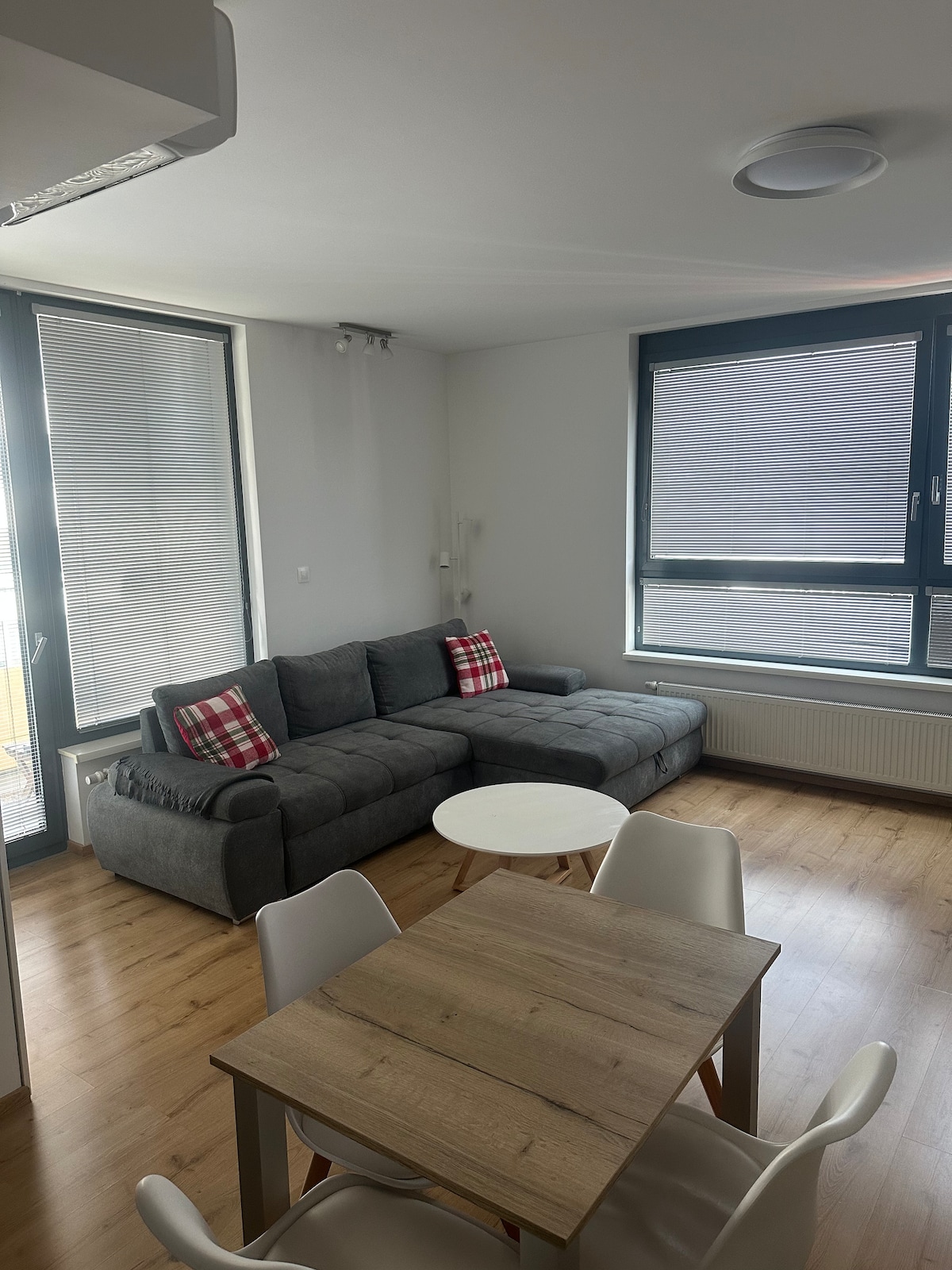 Wake up above Bratislava in a stylish 1-bedroom apartment on the 24th floor of Eurovea Tower with a spacious balcony and a panorama of the city center. - Fully equipped kitchen (presso, toaster, microwave, induction, oven, fridge with freezer, dishwasher). - Free fast Wi-Fi internet. - Large smart TV (Netflix, YouTube, HBO, Prime). - Sofa bed, large double bed. - Bathroom with bathtub, towels, and toiletries. - Washing machine, iron, dryer. - Air conditioning. - Parking included.