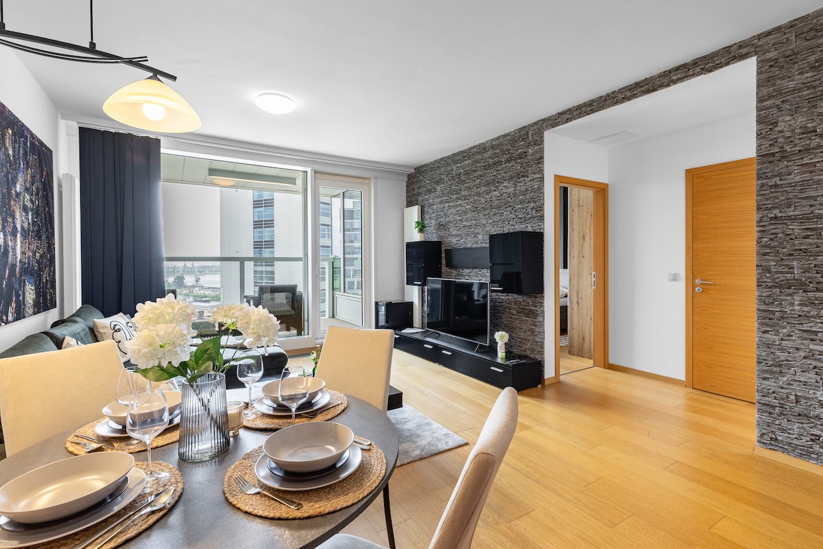 Zažite Bratislavu z výšky v úplne novom štýlovom apartmáne na 10. poschodí najvyššej budovy na Slovensku. Tento moderný a svetlý byt ponúka jedinečný výhľad na panorámu mesta, ktorý si zamilujete pri východe slnka aj pri večernom pohári vína. Apartmán sa nachádza v prestížnom komplexe EUROVEA, priamo na brehu rieky Dunaj. V budove máte priame prepojenie s nákupným centrom, kde nájdete reštaurácie, kaviarne, obchody, kino, fitnescentrum aj všetky bežné služby – suchou nohou.