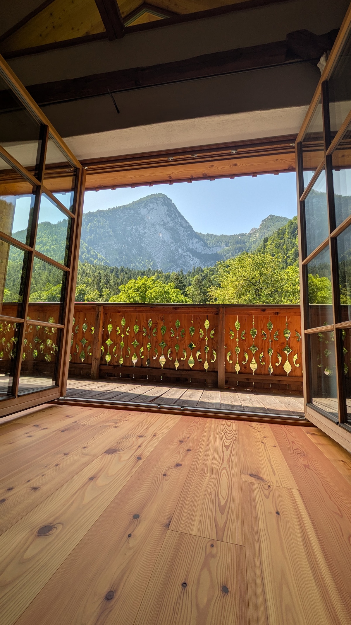 Loft im Atelier Dieses stylishe, gemütliche Loft in Etienne's Atelier liegt am Waldrand etwas außerhalb von Bad Ischl. Kunst- und Naturliebhaber kommen hier voll auf ihre Rechnung. Gehe auf Tuchfühlung mit dem Künstler Etienne, der im Erdgeschoß des Ateliers malt. Die Aussicht auf die malerische Bergkulisse ist berauschend. Von der Terrasse auf der Ostseite, kannst du beim Frühstück die Morgensonne genießen und hast einen wunderbaren Blick auf den Garten mit Teich und Grillplatz.