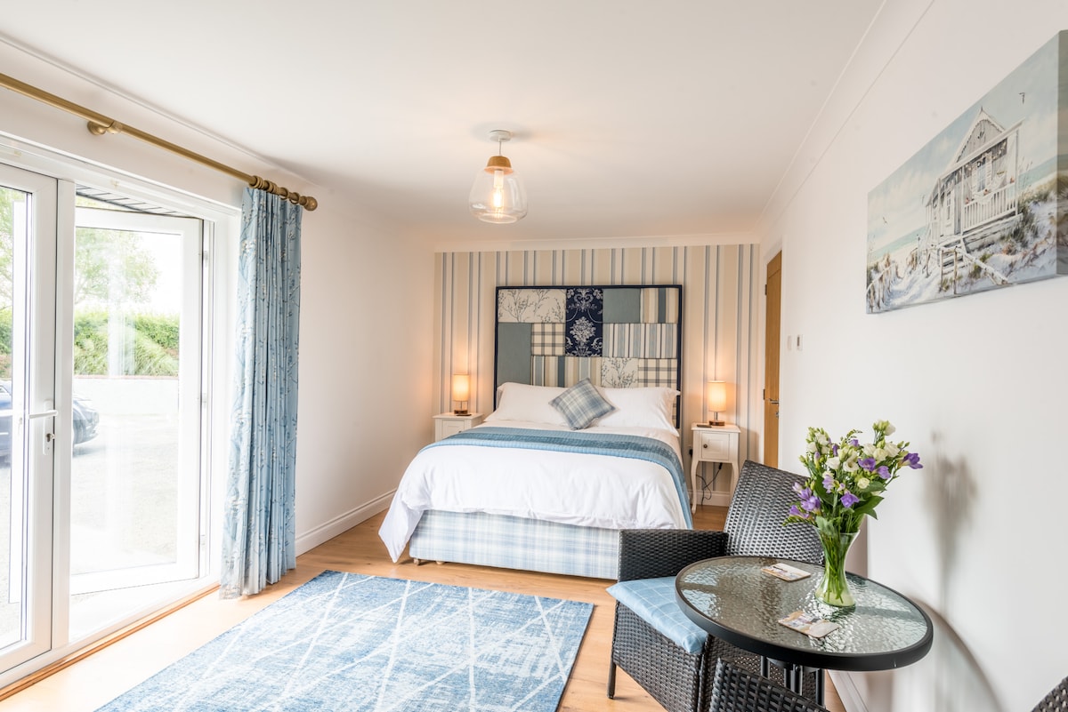 This is a newly decorated, spacious, clean, modern room with its own private entrance through patio doors. A luxurious double bed, wall mounted smart TV and plenty of drawers and hanging space, coupled with a comfortable sitting area including 2 chairs, tea and coffee making facilities and a mini fridge make this an ideal base for your visit to North Devon. A large en-suite wet room adds to the relaxed and quiet atmosphere of ‘Rue Paul Bert’ which is close to the centre of the village.