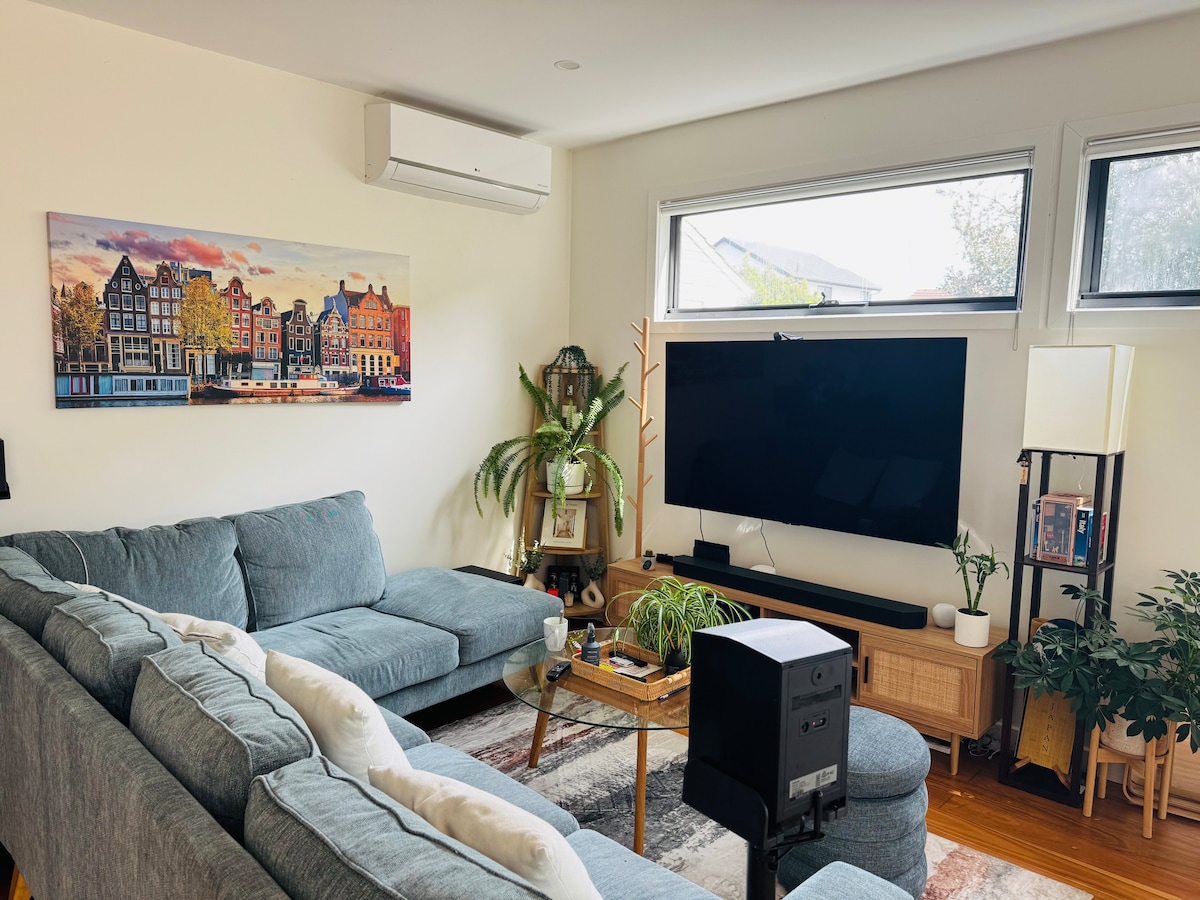 Inner-city townhouse on a quiet suburban street 9km from Melbourne CBD. 4 mins walk to the train station which takes you directly to Southern Cross. Extremely light and welcoming. Recently renovated with brand new appliances and 55" smart TV. Fully air-conditioned. Two bedroom with very comfortable double beds and a sofa bed in the lounge area. Outdoor alfresco area. 2 mins walk to local shops. Study nook, High speed 50mbs NBN internet. Washing machine & tumble dryer. OSP and small back garden.