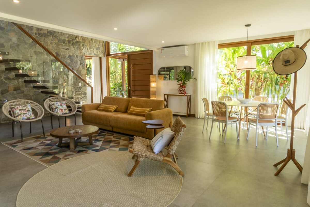 A Casa Maya Trancoso foi planejada pensando na valorização da integração de todos hóspedes em todos os momentos! Oferece um ambiente amplo e espaçoso, com as lindas portas mosaico de correr que se abrem ao longo de mais de 15 metros, integrando a sala de TV com a piscina e a área gourmet. Em padrão rústico, porém moderno, a casa oferece conforto com camas King Size e água quente com sistema boiler em todas as 4 suítes. Venha se hospedar nessa casa espetacular e se sinta realmente em Trancoso.
