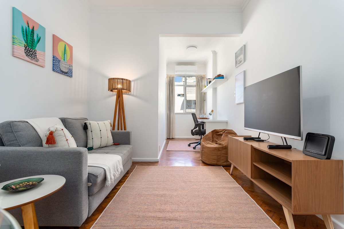 Studio recém-reformado em Copacabana, a 2 min da praia, ideal para casais. - Prédio residencial e familiar - Cadeira de praia - Portaria 24h - Ambiente integrado - Cama de casal com blackout - Ar-condicionado - Wi-Fi rápido - TV 50” - Cozinha equipada - Lava e seca - Silencioso Próximo ao Copacabana Palace, Rio Sul, vans para o Corcovado e ótimos restaurantes e bares.