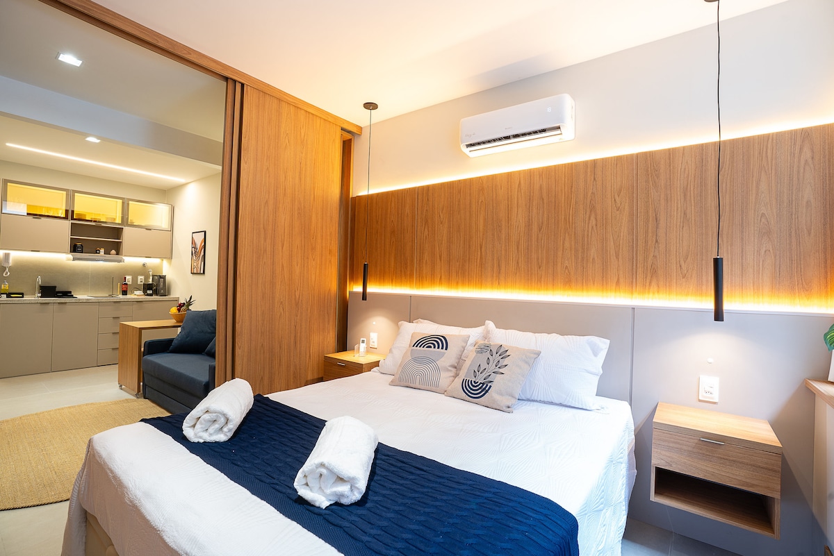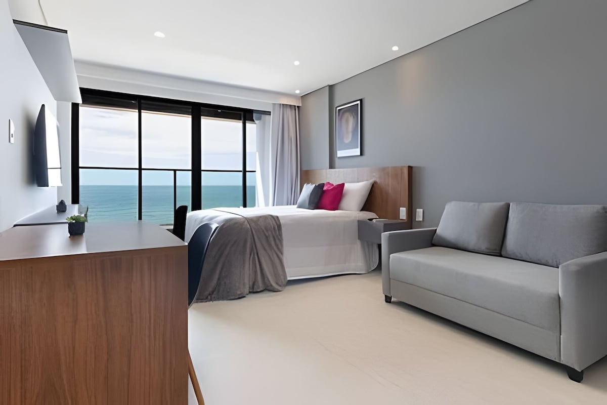Apartamento com vista cinematográfica e pé na areia. Vista ao mar de todos os ambientes. Pra lá de aconchegante, na melhor localização da cidade. Perto de tudo, shopping, bares e diversas opções de restaurantes. TV + Wifi Cozinha equipada Quarto com uma de cama de casal Sala com um sofá cama :( Como nem tudo é perfeito. Infelizmente não há vagas no estacionamento ): Relaxe neste espaço calmo ao som do mar e cheio de estilo, pois suas estadias aqui serão inesquecíveis.