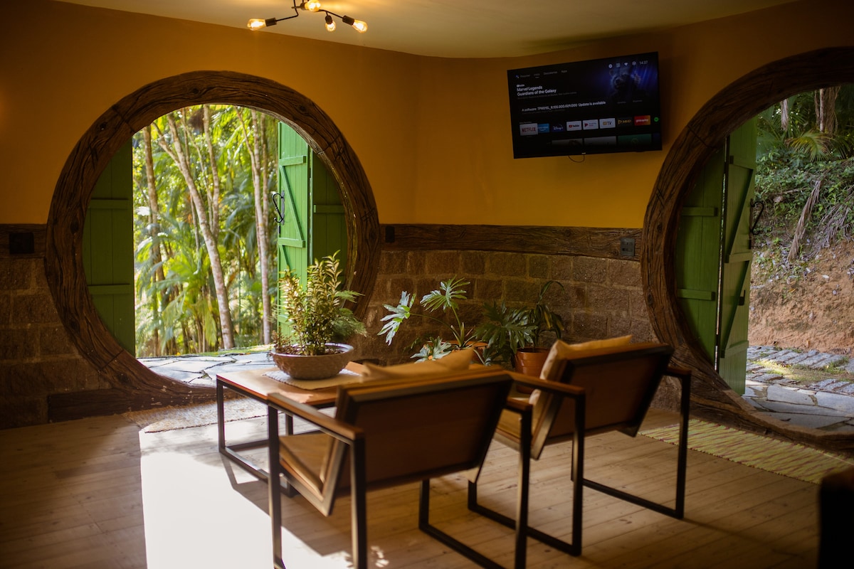 Inspirados nos contos de J.R.R Tolkien construímos uma Toca Hobbit lindal e hospedamos casais de "todos os reinos"! Venham também! Incluso o café da manhã para 2 pessoas, entregue na porta da Toca. No pet's. "Não era uma toca desagradável, fria e úmida, cheia de restos de minhoca e cheiro de lodo, tão pouco uma toca seca, vazia e arenosa, sem nada em que se sentar e o que comer! Era a toca de um Hobbit, e isso quer dizer boa comida, uma lareira quente e todo conforto de um lar" Bilbo Bolseiro