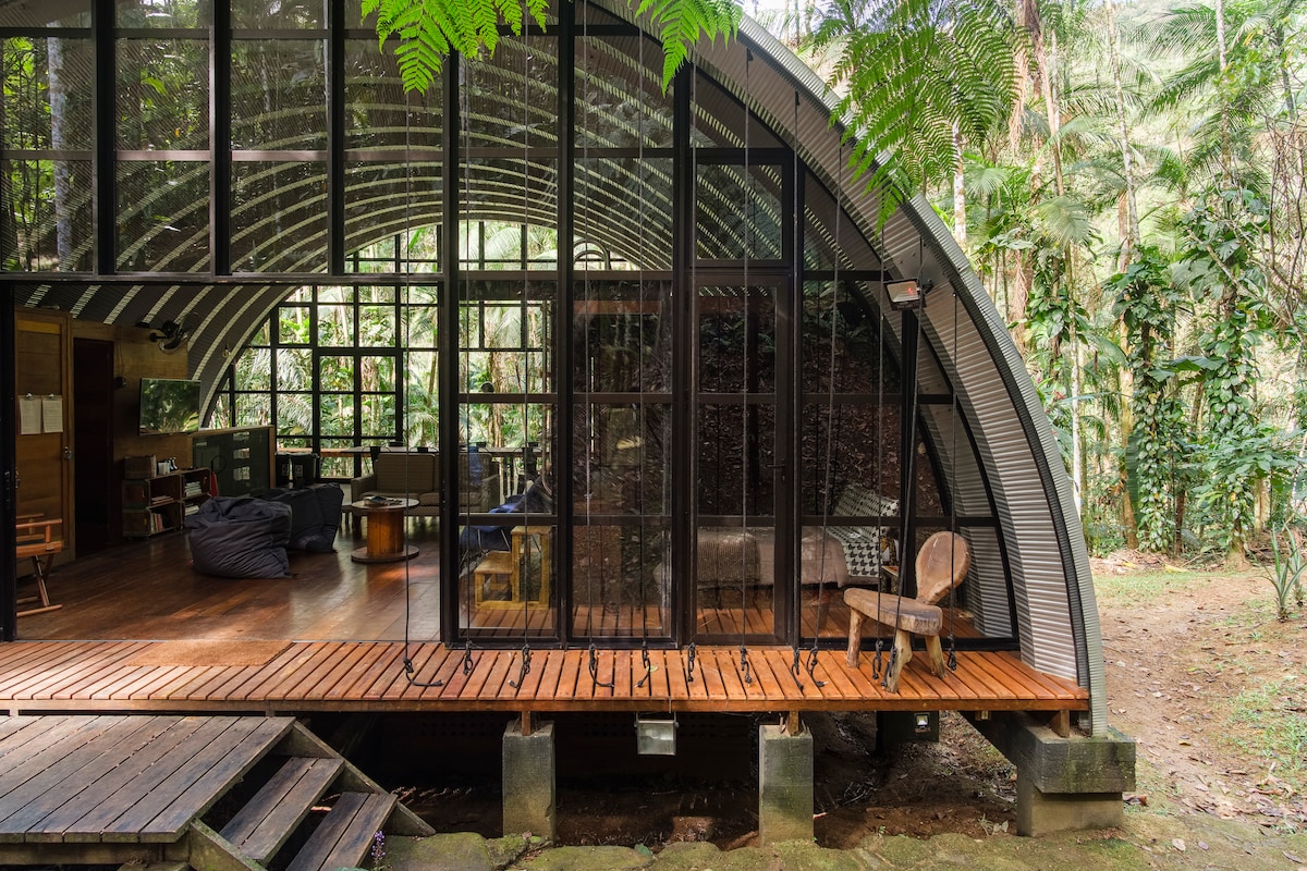 Sip a refreshing glass of the natural spring water, then take a dip in the secluded natural pool at this nature-inspired, architectural masterpiece in the forest's heart. Pick bananas, look for monkeys and watch blue butterflies fluttering by too. Located in Aldeia Rizoma ecological condominium (15-25 min from Paraty dowtown), the house is very comfortable, fully equipped and with Starlink internet connection.