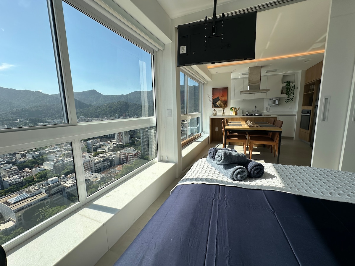 Uma espaçosa suíte de hóspedes em cobertura, c/ uma vista maravilhosa do Cristo Redentor e Lagoa Rodrigo de Freitas. Tem uma grande área externa c/piscina aquecida e cascata, lavabo, sauna a vapor c/ducha, cozinha, churrasqueira, geladeira, cooktop, microondas, Airfryer e utensílios de cozinha. O acesso para a suíte é independente. A Suíte fica a dois passos da ciclovia da Lagoa Rodrigo de Freitas, 5 minutos a pé do Jardim Botânico, 10 minutos de carro da praia de Copacabana, Leblon e Ipanema.