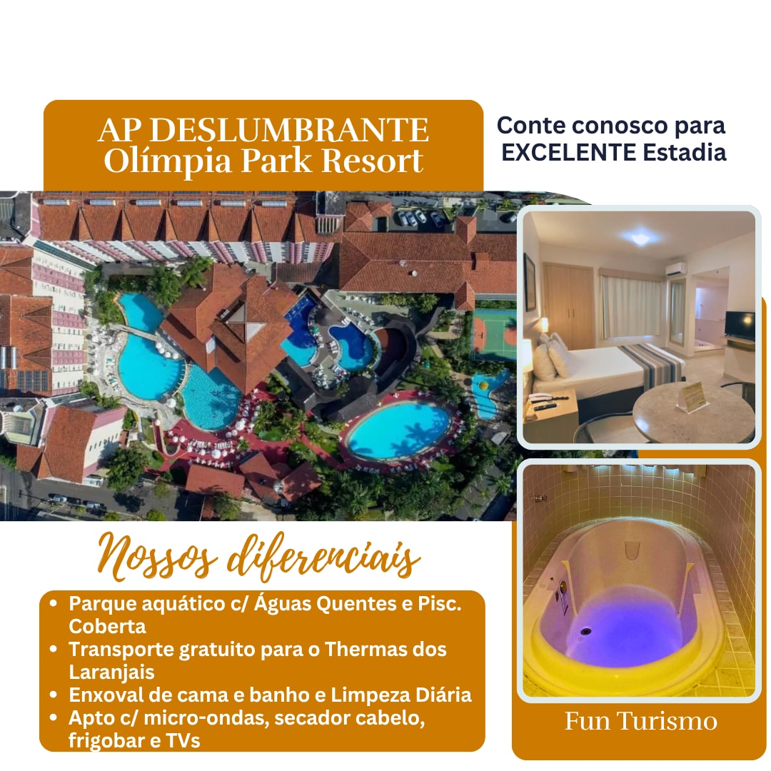 O apartamento fica localizado dentro do Resort Enjoy Olímpia Park Resort. Fica localizado a 100 metros do famoso Thermas dos Laranjais e a poucos minutos de carro do Parque Aquático Hot Beach, que é um parque com menos badalação, porém com muita qualidade. O Resort possui academia, cinemas, lojas, estacionamento, diversas piscinas aquecidas e piscinas infantis, além de playground e salão de jogose restaurantes (Café da manhã é disponibilizado, porém não está incluído).
