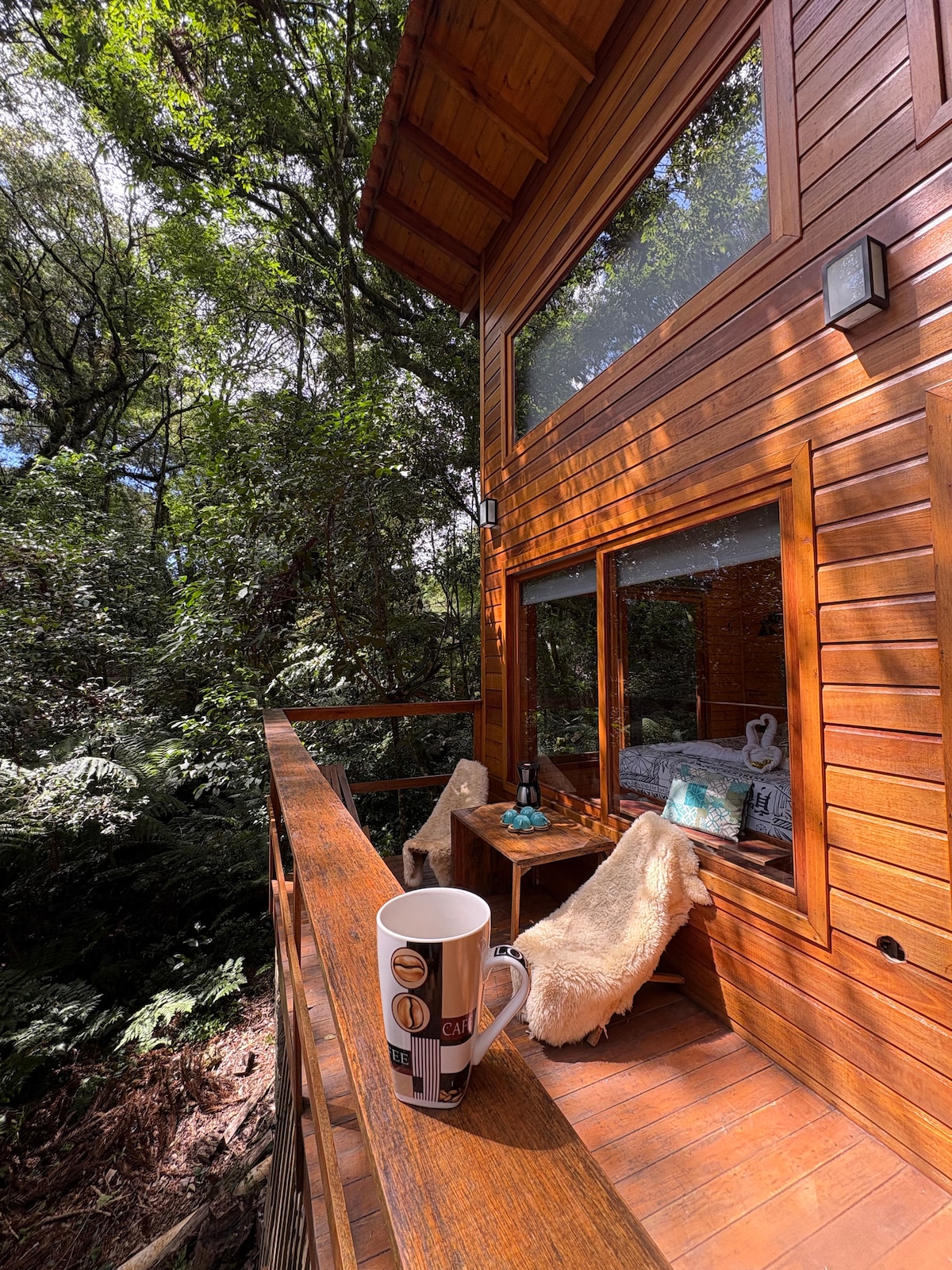 Discover "Mirante da Coruja", a tranquil refuge amidst the treetops, built with reclaimed pinho de riga wood. This glass-walled chalet provides privacy, comfort, and stunning views. Equipped with a fireplace, a private deck, and a spacious terrace, it becomes the perfect backdrop for special celebrations and relaxing moments, combining local art authenticity with the magnificent surrounding nature.