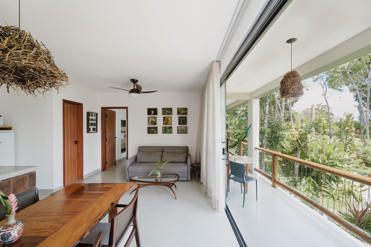 Um refúgio banhado pelo sol, com varanda aberta e vista para o mar. Acorde com o som dos pássaros, tome café com a brisa entrando pela porta e sinta que o tempo parou. Venha viver dias leves. Apartamento 2/4 no andar superior, na Mata Atlântica com uma linda vista para o mar e o Rio de Contas, um refúgio bem próximo do centro de Itacaré. * CASO SEJA ALUGADO PARA 2 PESSOAS, A SUITE MENOR FICARÁ FECHADA*