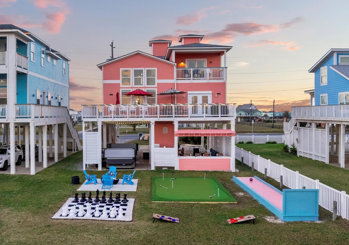 Relax with the whole family at our sturdy & newly renovated beach home, located steps away from the beach. Our large home is situated on an expansive corner lot & features beach and bay views. Enjoy listening to the ocean waves & stunning sunsets while you sip coffee or wine from our oversized deck. Enjoy s’mores from our outdoor fire pit. Our home is not a typical Galveston AirBNB as it is our family’s vacation home and very well maintained.