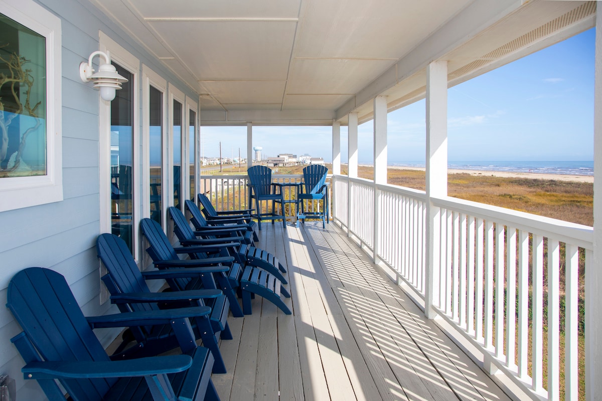 Relax with the whole family at our sturdy & newly renovated beach home, located steps away from the beach. Our large home is situated on an expansive corner lot & features beach and bay views. Enjoy listening to the ocean waves & stunning sunsets while you sip coffee or wine from our oversized deck. Enjoy s’mores from our outdoor fire pit. Our home is not a typical Galveston AirBNB as it is our family’s vacation home and very well maintained.