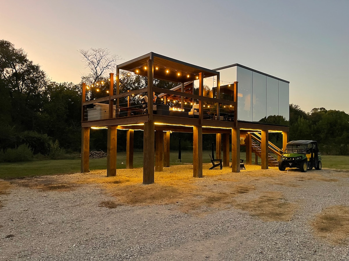 Explore an expansive viewpoint of the Texas Hill Country. This handbuilt, one-of-a-kind treehouse is nestled on 37 forested acres. With its unique design and stylish interiors, private half mile hiking trail, hammocks, and screened in porch, the treehouse invites you unwind, rest, and recharge in nature. You won’t be surrounded by other Airbnbs here. Book a night or two and enjoy some peace. (The covered outside staircase takes you from the downstairs kitchen/bathroom to the 2nd floor bedroom.)