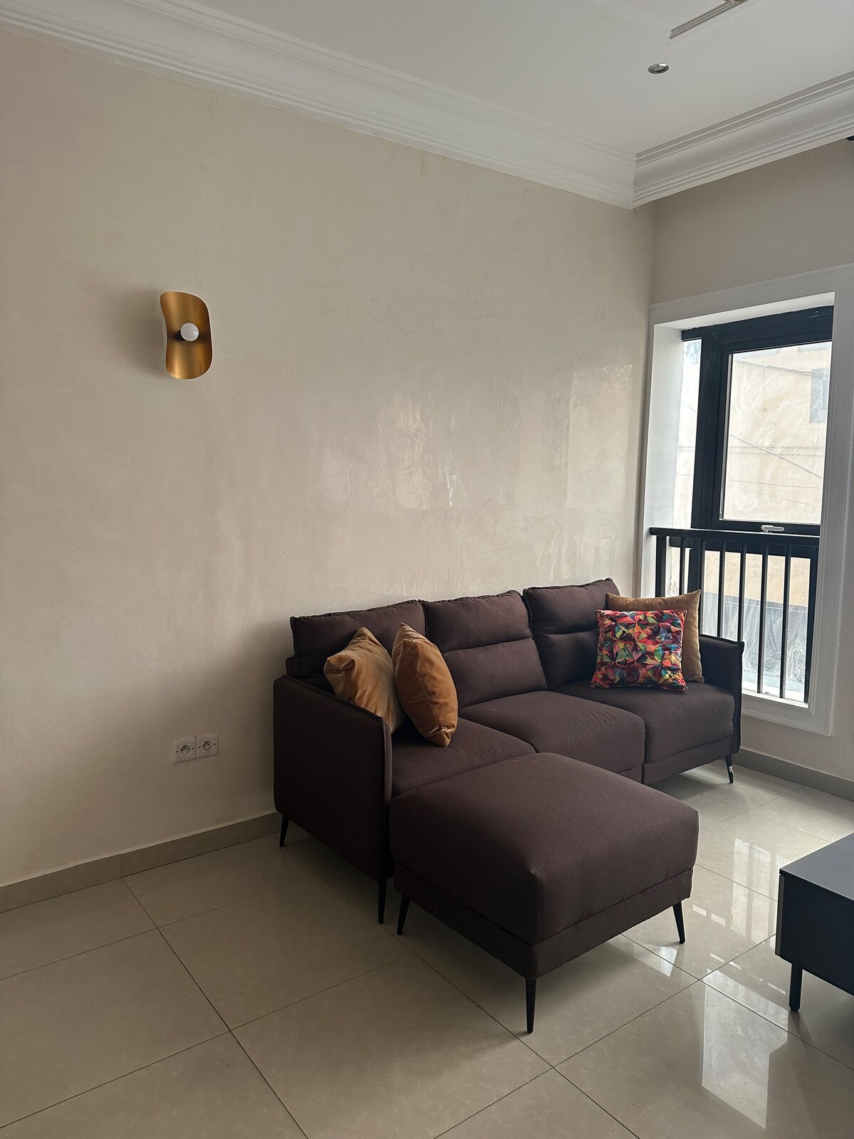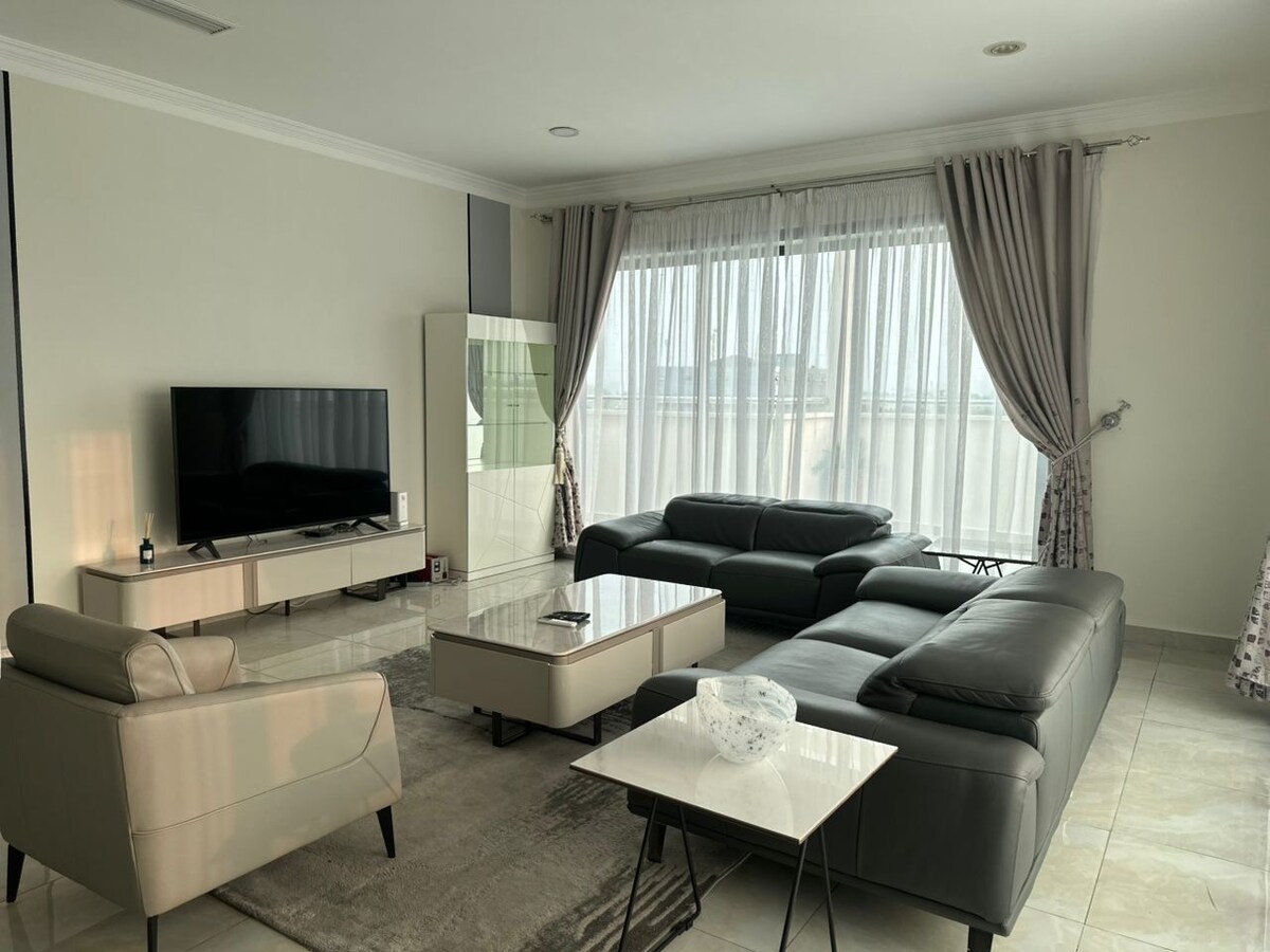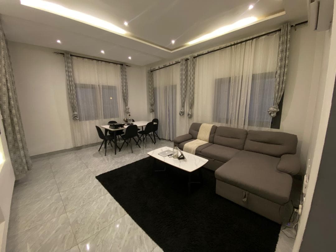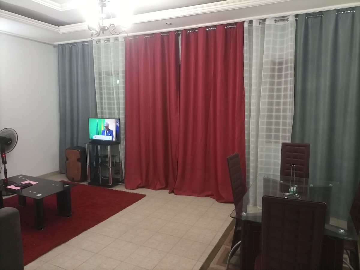 Oubliez vos soucis dans ce logement spacieux et serein, avec une grande chambre et une deuxième chambre d’appoint avec canapé lit, L’appartement est situé à 2 min en voiture de l’aéroport international de Maya Maya au deuxième étage, dans immeuble récent avec ascenseur, une vue sur la villa 🏙️, vous avez un accès Netflix, groupe électrogène,