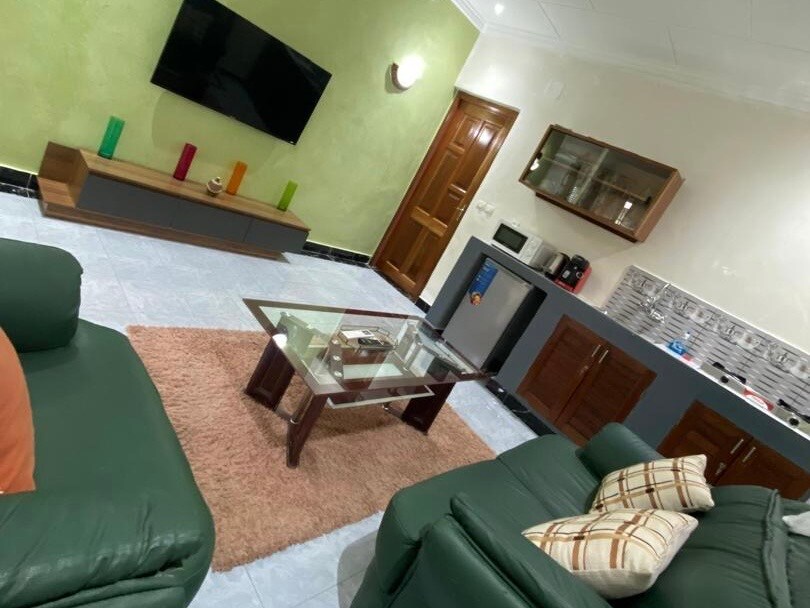 Ce logement paisible offre un séjour détente et sécurisée pour toute la famille dans la clôture. Maison de 2 chambres à Mbouono (banlieue proche de Brazzaville) dans le 8e Arrondissement Madibou; Logement entièrement climatisée, et équipé: 2 chambres avec 2 lits doubles et placards chacune, une tv dans l’une des chambres; Salon avec salle a manger, tv plus WiFi; Cuisine équipée frigo américain.