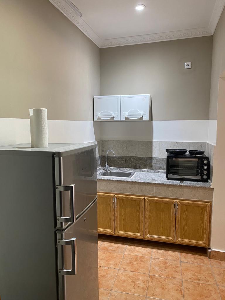 Un studio meublé avec cuisine américaine équipée de toutes les commodités,une salle de bain,un débarras pour bagages,un espace de repas et travail,un écran plasma, canal plus connexion internet illimitée de canal box.