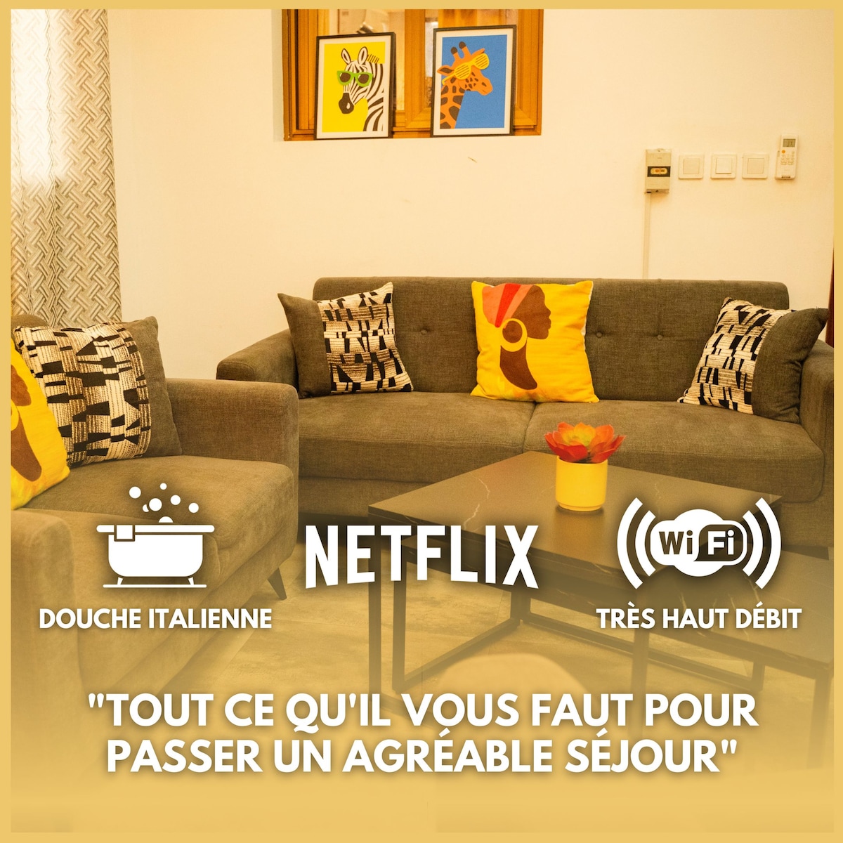 Un logement unique et élégant . Il est situé en centre ville, proche de toutes les commodités, ce qui facilite vos visites touristiques ou vos rendez - vous d’affaires. L’appartement est très confortable, il est équipé d’un climatiseur, cuisine équipée, chauffe eau et un petit groupe électrogène…