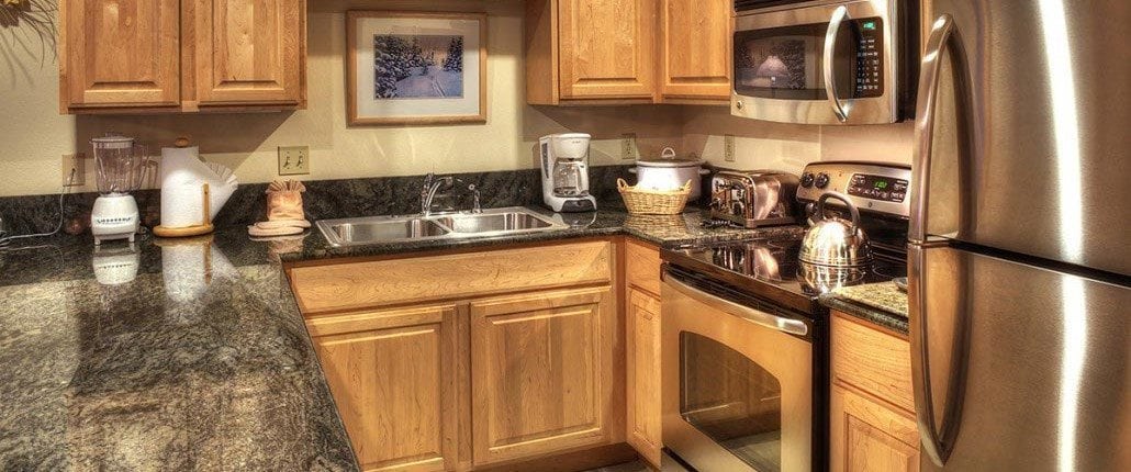 This 1 bedroom condo features a partial mountain view and cedar paneled walls, giving it a real rustic, mountain-contemporary style. The brick fireplace is best enjoyed when using the two mounted speakers it sits between. Including a full kitchen – the unit features a coil-top stove, microwave, toaster, dishwasher and refrigerator. The cozy bedroom houses a King size bed and a dramatically designed dark wooden bed frame.
