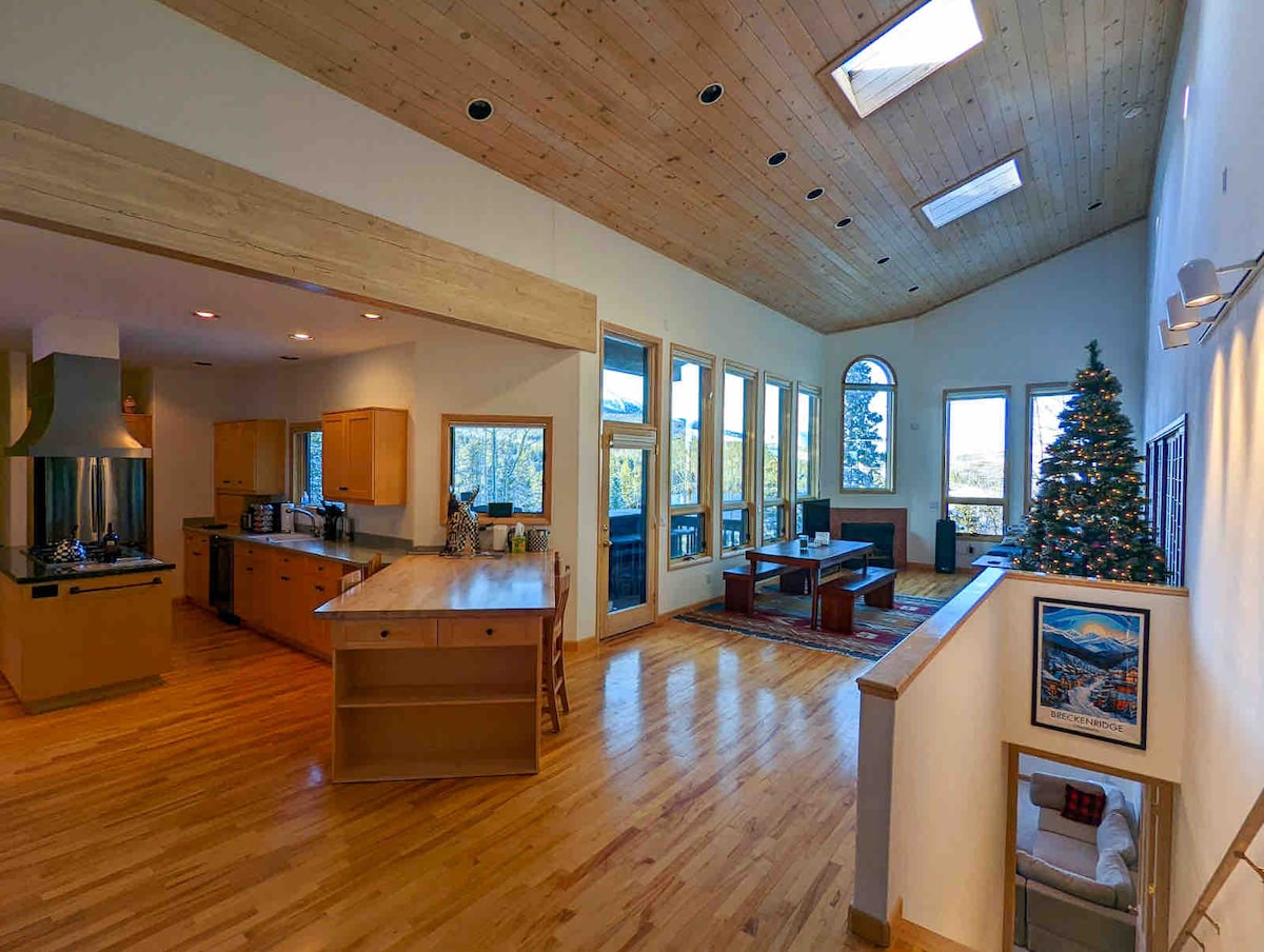 Nestle in this luxurious 8-bed chalet on Peak 7, a snowy mile from Independence Superchair, offering a indulgent ski retreat with serene mountain views. Spanning across 4,300 sq. ft., this secluded private haven exquisite house hosts large groups in style. Post-slopes, unwind in the 7-person hot tub or detox in the sauna with rocky vistas. Pet friendly with a fenced dog run for furry friends. A short drive to Main St for vibrant dining and nightlife. Your mountain escape awaits!