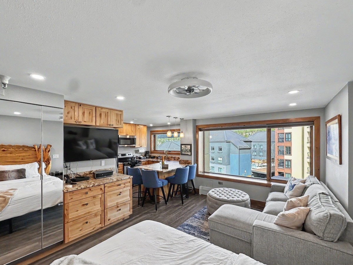 Village at Breckenridge Resort! The view from this modern studio is stunning! Wake up every morning to the beautiful Rocky Mountains right out your window. Slopeside is a cozy studio condo with a King bed and comfy sofa sleeper that can easily sleep 4. The space is perfect for a family of 4, romantic getaway, or a friend's holiday trip! The location is the best in town! Just steps from the Quicksilver lift on Peak 9, ski school, hiking trails, and abundance of local shopping and award win
