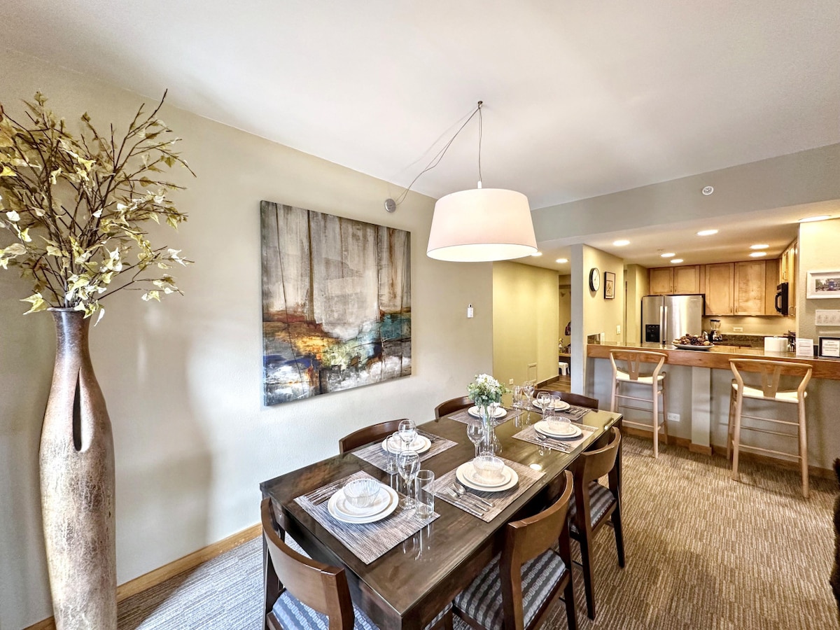Bring the whole gang and enjoy your stay in an unbeatable location just steps to Main St! This newly-renovated condo accommodates up to 9 guests and is a short stroll to the Village and S. Main St. Cozy up around the fireplace in our spacious living room or enjoy morning coffee on the deck. You will have access to the condo’s large hot tub, workout room, and the clubhouse with ping pong, pool table, foosball, and a big screen TV. Whether you stay in or go out, there's something for everyone!