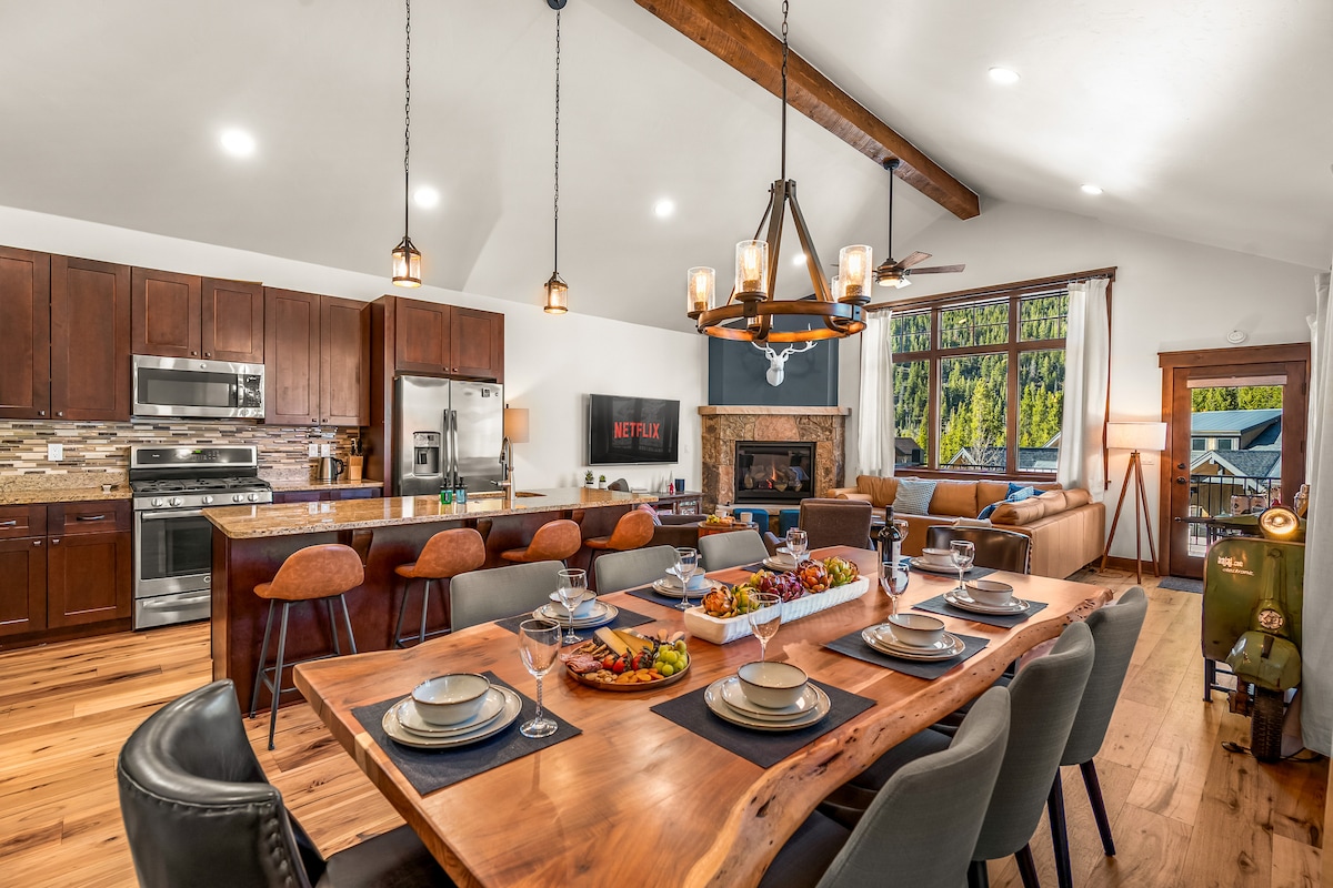 Spacious 5-bed, 5.5-bath mountain retreat with stunning views, private hot tub, huge deck, and three cozy fireplaces. Perfect for families and groups with two living rooms, fully stocked kitchen, and a 2-car garage. Minutes to world-class ski resorts, hiking, and dining. Enjoy soaking tubs, comfortable bedrooms, and peaceful alpine scenery—all in a beautifully appointed 4,100 sq ft home built for unforgettable stays.