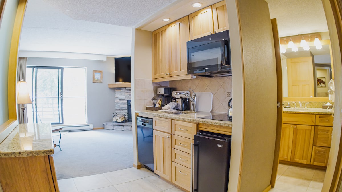 Village at Breckenridge Resort! The view from this modern studio is stunning! Wake up every morning to the beautiful Rocky Mountains right out your window. The Bear's Den is a cozy studio condo with a King bed and comfy sofa sleeper that can easily sleep 4. The space is perfect for a family of 4, romantic getaway, or a friend's holiday trip! The location is the best in town! Just steps from the Quicksilver lift on Peak 9, ski school, hiking trails, and abundance of local shopping and award win