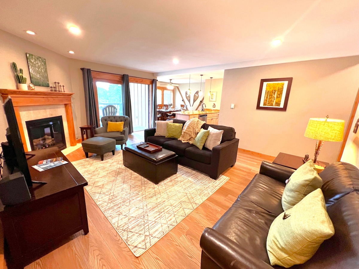PLEASE NOTE: Pool complex closed April 27th-mid May 2026 Early check in/Late check out not available. Kick back and relax in this calm, stylish space. Our warm and welcoming condo is nestled in a quiet but convenient area very close to lifts and town. Cozy up to the gas fireplace, Relax on the covered deck Adirondak chairs with coffee or a cocktail. Use the provided robes to take an easy stroll to the pool and hot tubs after a day of skiing or hiking. Mountain luxury is just a click away!