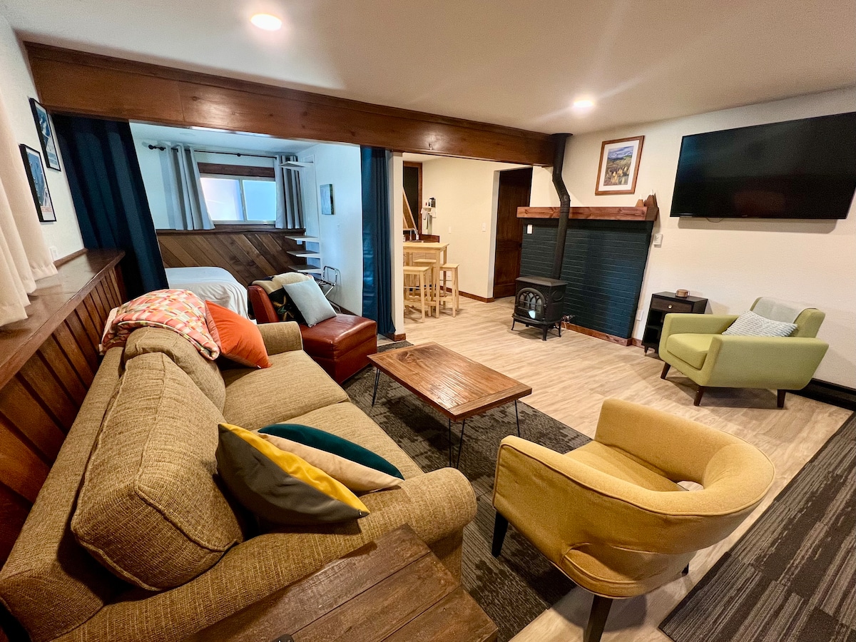 A snug is a small and suite that's designed to offer peace and relaxation Mount Royal Snug offers Western Charm with wood floors, bright ground level private entrance. Close to the 10 Mile Music Hall A custom King bed with new mattress Rustic electric fireplace will provide plenty of warmth while watching your 45” flat screen TV. High speed Wi-Fi. AC for summer The snug comes complete with microwave, coffeemaker, coffee, tea, and a refrigerator Private bath offers large tiled shower.