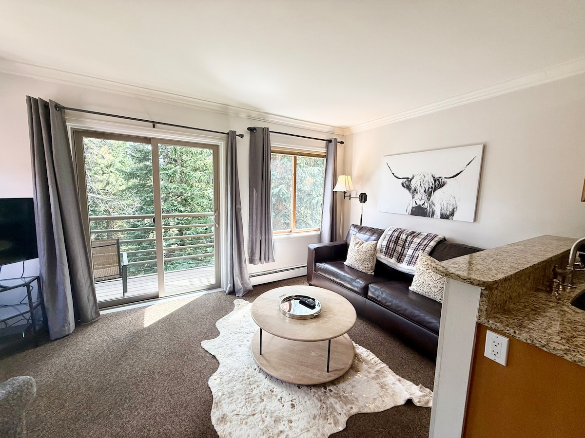 Village at Breckenridge Resort! The view from this modern studio is stunning! Wake up every morning to the beautiful Rocky Mountains right out your window. The Bear's Den is a cozy studio condo with a King bed and comfy sofa sleeper that can easily sleep 4. The space is perfect for a family of 4, romantic getaway, or a friend's holiday trip! The location is the best in town! Just steps from the Quicksilver lift on Peak 9, ski school, hiking trails, and abundance of local shopping and award win