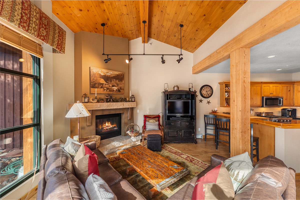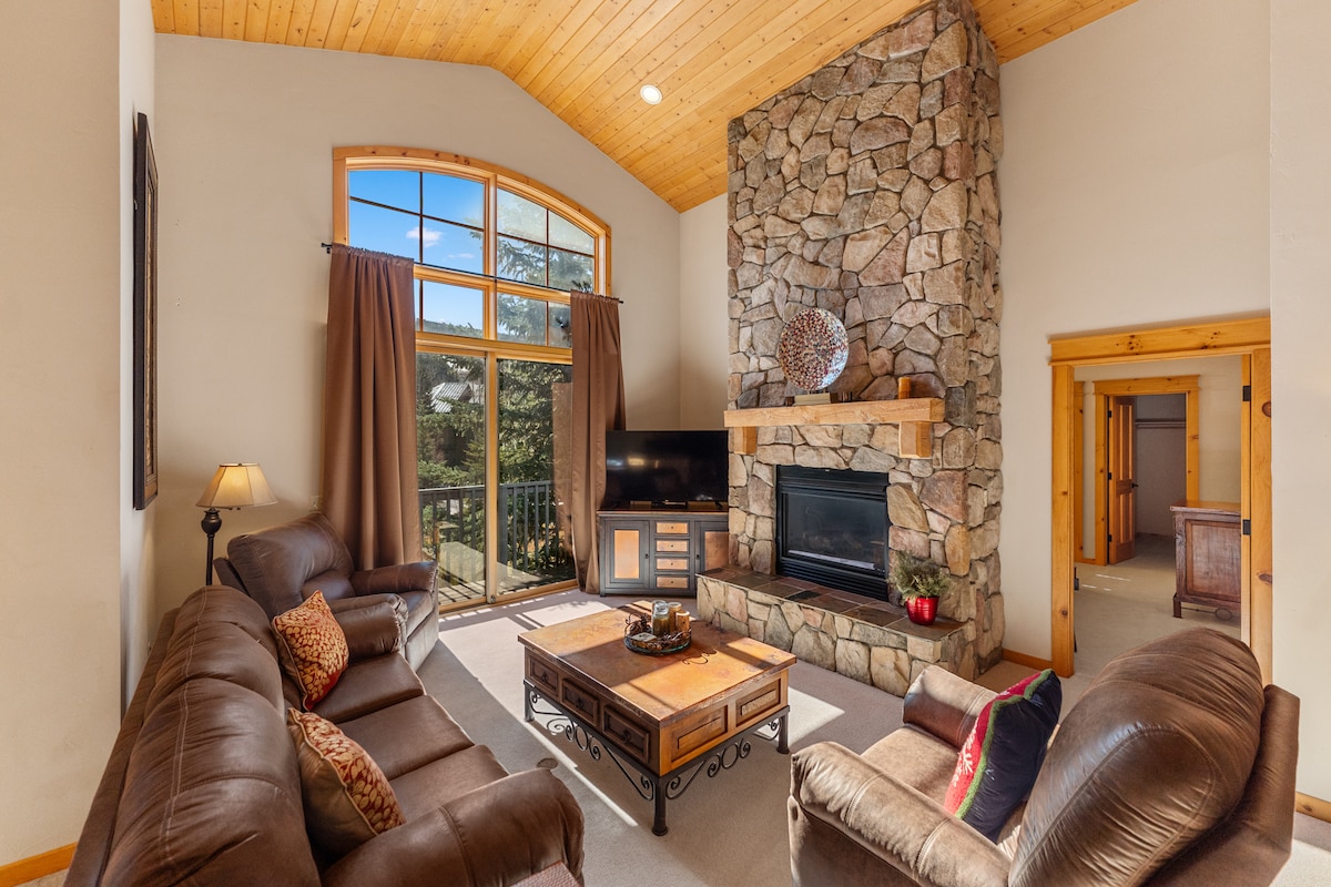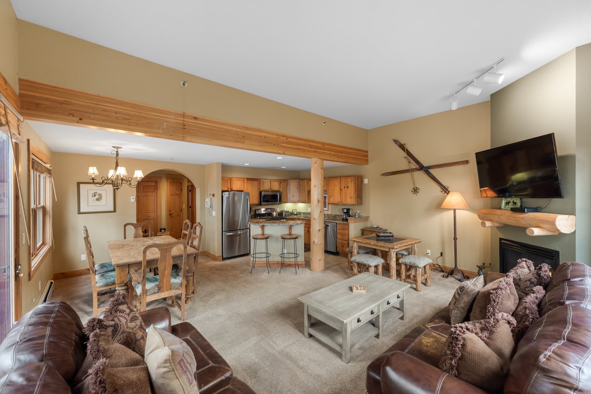 This 2-bedroom, 2-bathroom townhome sleeps 7 with a king bed, bunk bed, and queen sleeper sofa. It features beautiful slope views. Vaulted ceilings and large windows allow lots of natural light in the living area and primary bedroom. Other features include a private laundry and private garage. You're a very short walk from nearby shops and restaurants. Plus, you're also a short walk from the gondola at River Run and the Mountain House lifts.