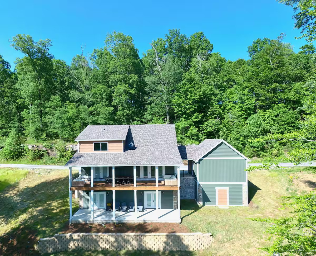 Newly renovated dual-family vacation cabin accommodates up to 16 guests! Get lost in the rustic luxury of this spacious retreat, featuring dual living spaces, 2 kitchens, 5 bedrooms plus loft bunks and game room! Enjoy the lake forest scenery from the multi-tier deck terrace or explore the natural cliff rock along the private path to the lake. Guests can fish, kayak, paddle board and swim right from the property shoreline! Located just 1 hour from Louisville, Mammoth Cave and Holiday World.
