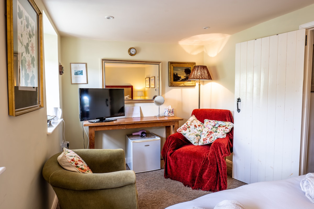 Dogs Allowed £25 per dog per stay Large room with superking bed with 100% cotton bed linen. Seating area with sofa and large comfortable chair with TV . Kitchenette with Fridge and microwave and Small countertop electric Oven En-suite shower room . Within easy reach of the City or the coast Our sunny South facing garden is part fenced and we have 2 friendly dogs There is a table outside with two seats. Cushions and tablecloth and sun chairs stored inside
