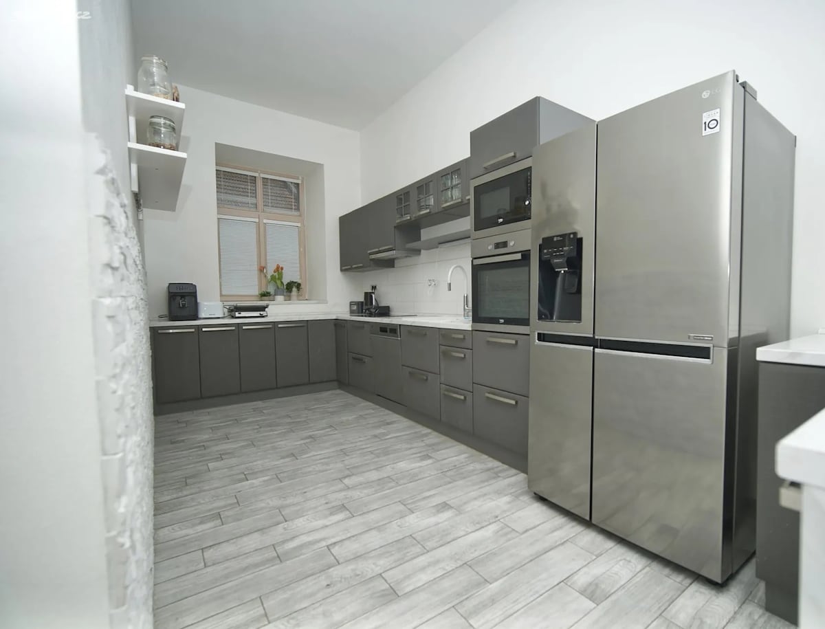 Stylové ubytování v Hustopečích u Brna v soukromí a klidu historického měšťanského domu ze 16. století uprostřed centra města. Ideální místo pro páry či rodinu s dětmi, které chtějí poznat krásy jižní Moravy v komfortu. Apartmán nabízí pohodlí pro 2 až 4 osoby na ploše 55 m². Prostorná obytná místnost s krbem a francouzskými okny spolu s manželskou postelí a možností dalších dvou lůžek. Součástí také plně vybavená kuchyň s myčkou a velkým kulatým jídelním stolem ideálním pro společné chvíle.