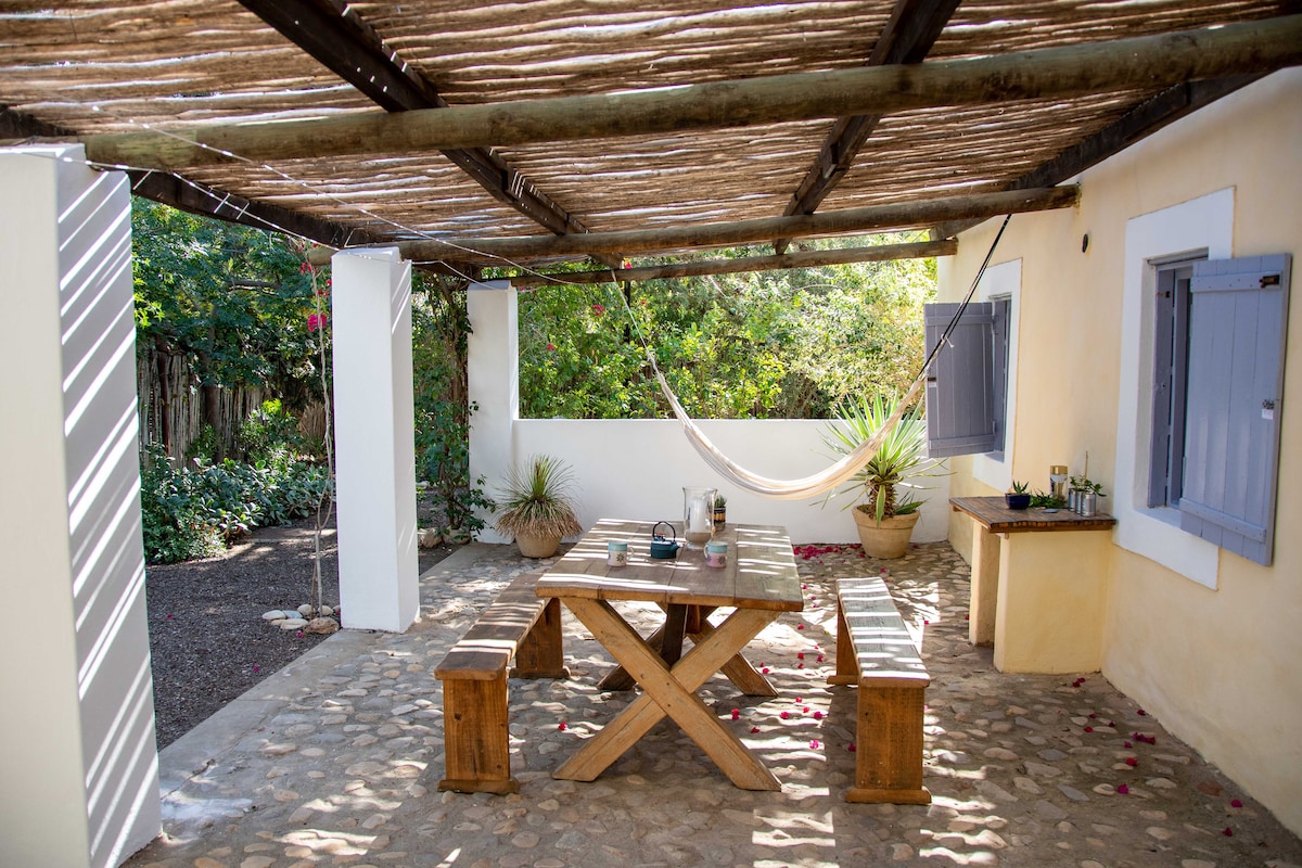 Sunflower Cottage is a romantic self-catering cottage in McGregor, and is one of the oldest and most loved historical houses in the village. Originally built in the 1880’s, its thick adobe walls, original mud floors, reed ceilings and thatched roof are natural insulators against the heat and cold of the Little Karoo. Located in a quiet corner of the village, the cottage is perfect for couple getaways, to explore this historical town and surrounding winelands.