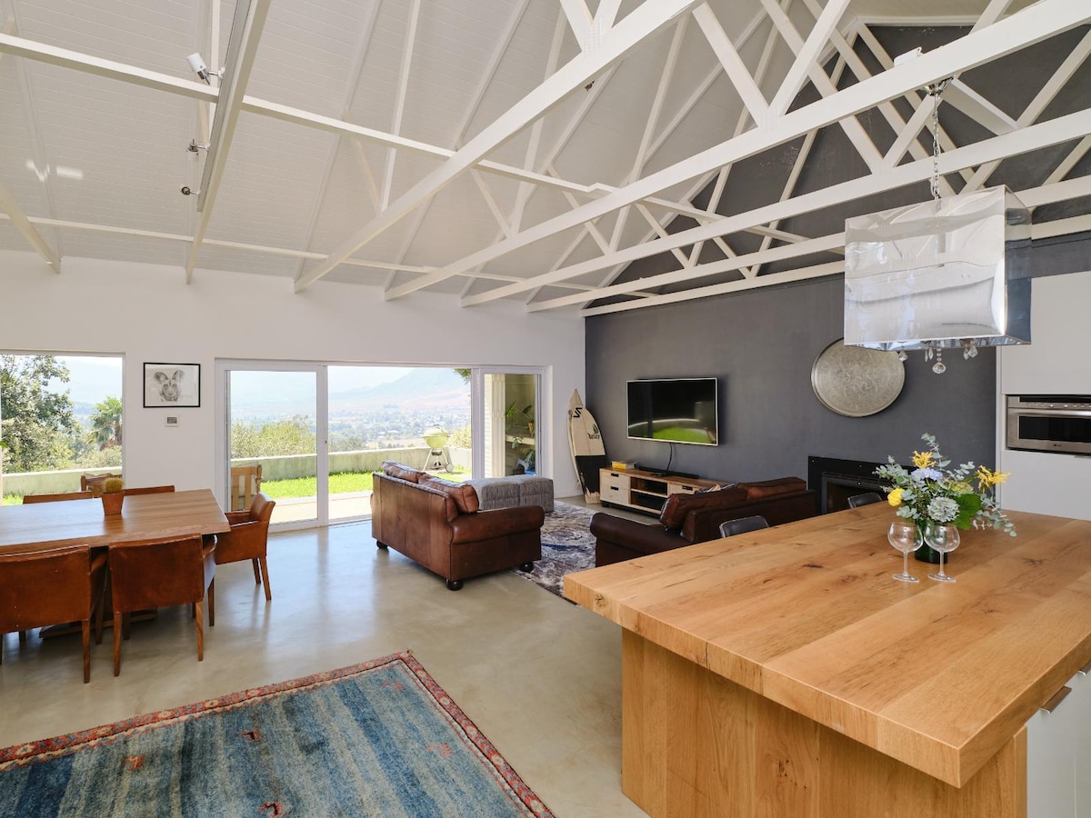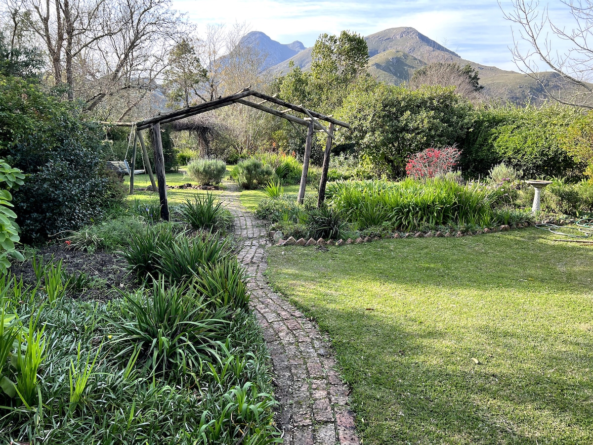 Hanepoot Cottage is close to Franschhoek village. You’ll love the cottage because of the spacious, private, setting on a working wine and fruit farm nestled against the mountains of Franschhoek Valley. Good for couples, solo adventurers, business travelers, and families (with kids). You are welcome to explore the farm and even practice your chipping and putting skills on the green.There is an inverter to provide electricity during loadshedding periods.