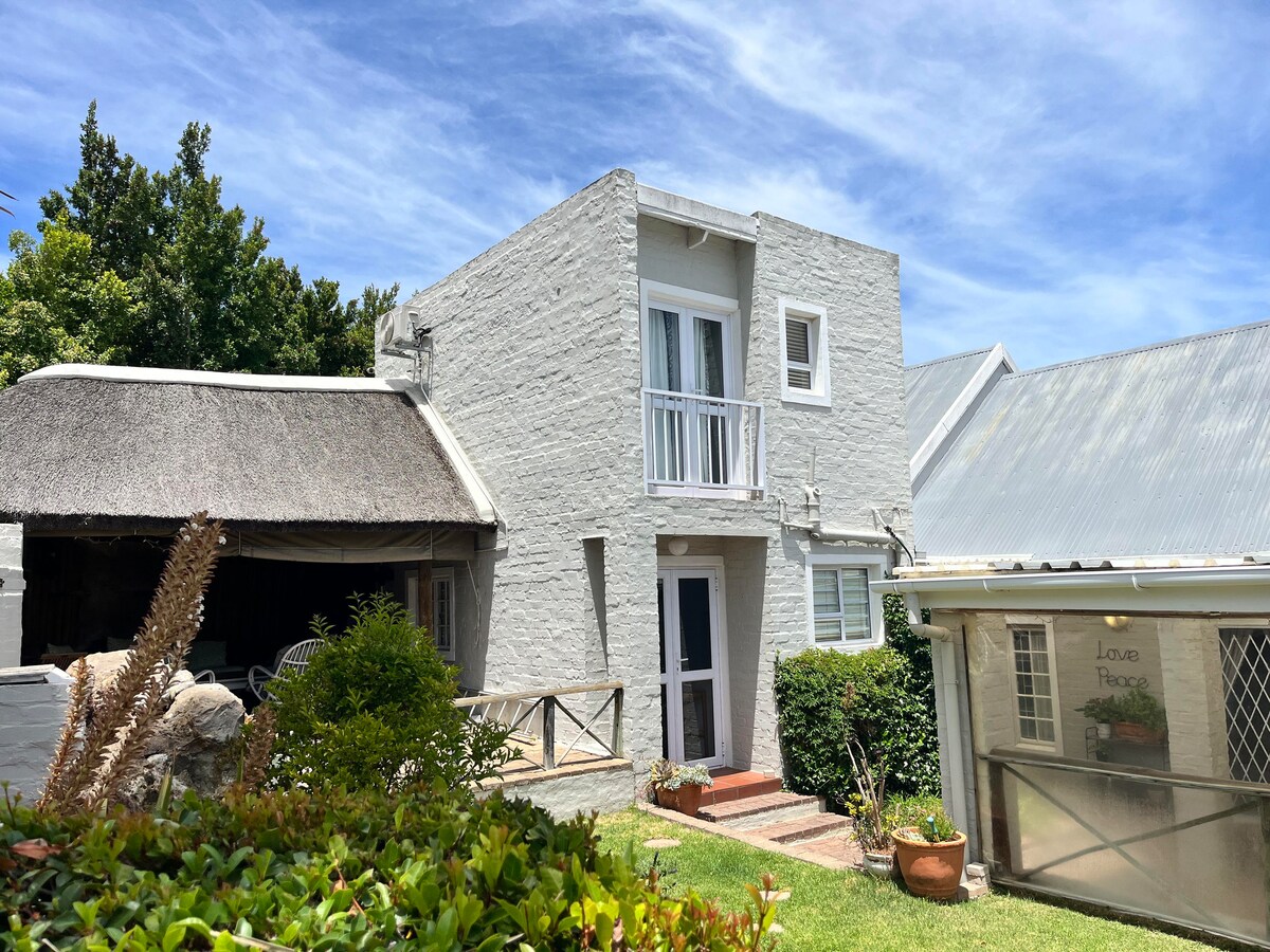 Our studio is a separate self catering unit in a forest garden with it's own entrance and off street parking.. We are in an upmarket quiet neighbourhood and 5 min. drive from the historic town centre. It has a king bed, couch {converting into a wide single bed for a child} , kitchenette, private bathroom (en suite), terrace and a swimming pool. The 5 schools and MediClinic hospital is 5min. drive away. We're at the start of the famous Stellenbosch mountain for hiking and mountain bikes..