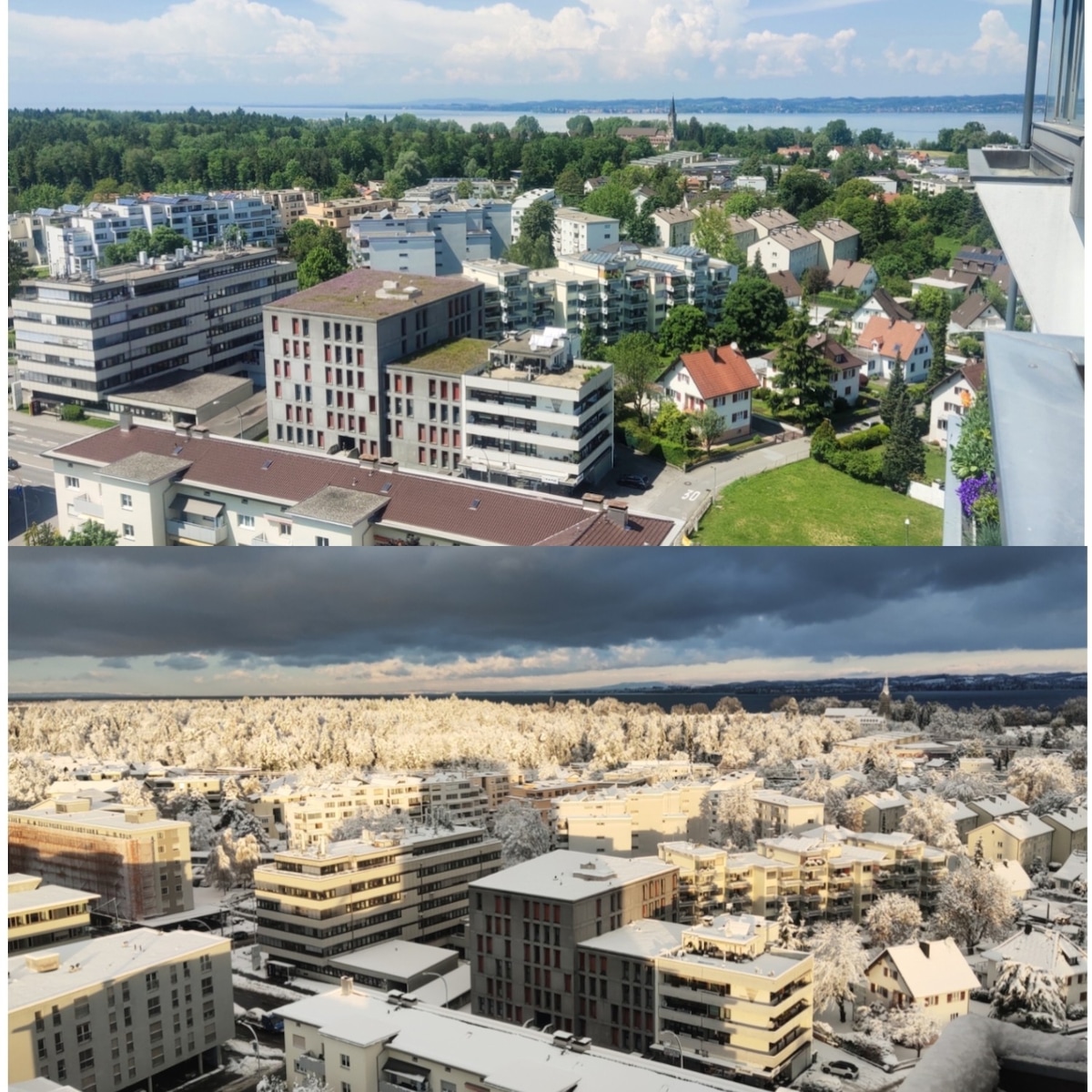 This bright top-floor apartment features a cozy living area with a sleeping nook, a desk, and plenty of natural light. The fully equipped kitchen with a dining area combines style and functionality. The spacious balcony offers stunning views of the city and mountains. The modern bathroom with a bathtub ensures comfort. A free parking space is available. Shops, restaurants, and the train station are nearby, while Lake Constance and the Festival Hall are about 1 km away.