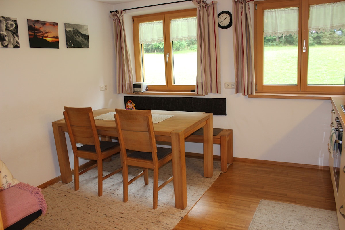 Suchen Sie eine gemütliche, familienfreundliche Gruppenunterkunft 10+ mit Hüttencharakter und Kachelofen? Die große Ferienwohnung befindet sich in einem freistehenden Haus mit mehreren Wohnungen inmitten von Kälberweiden mit herrlichem Talblick. großem Gemeinschaftsgarten mit Grillplatz. Wandern und Mountainbiken von der Haustüre weg. Die Familienskigebiete Hochhädrich, Hochlitten und Steibis sind in wenigen PKW-Minuten erreicht.