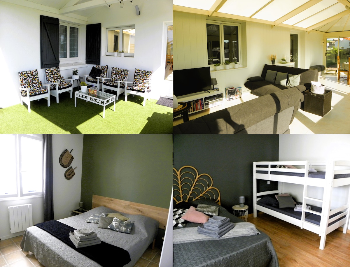 Votre séjour se déroulera dans cette maison de 170 m2 habitable. En plus de ses 4 chambres toutes avec placard, le salon ( sa PS3) la véranda et la cuisine toute équipée, vous permettront de vous retrouver en famille ou entre amis. Le coin lecture, avec ses jeux et livres pour tout âge réjouira petits et grands. Une dépendance stock les 5 vélos et la trottinette, les jeux extérieurs ainsi que le barbecue, vous pourrez y entreposer vos planches de surf,... Tout est réuni pour votre séjour😊