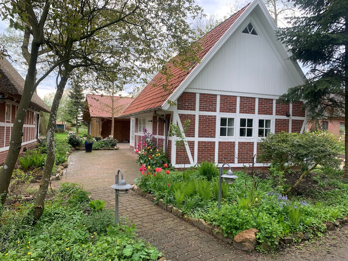 Die Ferienwohnung ist der Anbau eines sehr gepflegten Kehdinger Fachwerkhauses, umgeben von einem sehr schön angelegten Garten mit gemütlichen Sitzplätzen und Kinder-Spielgeräten. Die modern und gemütlich eingerichtete Wohnung ist 2-geschossig , verfügt über einen großen Wohnraum mit offener, gut ausgestatteter Küche und einer großen Terrasse im 1. Stock. Genießen Sie die Abgeschiedenheit vom Arbeitsalltag inmitten von Moorwiesen, nicht weit vom Elbdeich und der historischen Altstadt von Stade.