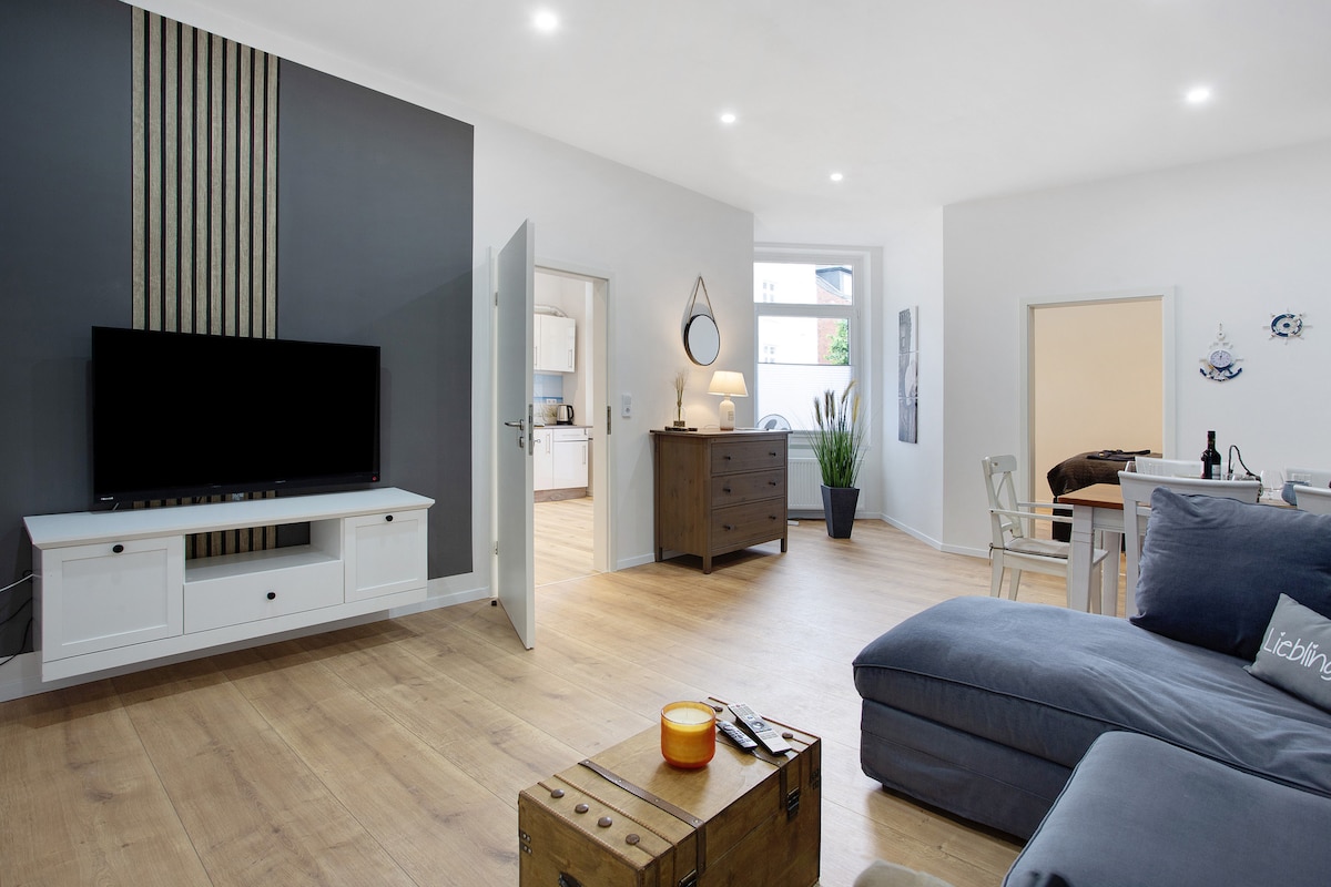 Erleben Sie Entspannung pur in unserer frisch sanierten Ferienwohnung mit großzügigem Wohn- und Essbereich. Zentral gelegen direkt am Brommygrün Park ca. 10 Min zu Fuß in die Innenstadt, 15 Min zur Deichbrücke, 5 min zum Kurpark - perfekt für Paare oder kleine Familien, die Lust auf Abenteuer und gute Laune haben. Highlights: Regendusche, Balkon auf der Sonnenseite, WLAN, Flachbild-TV mit Netflix! Komfortabel, hell, sauber – einfach Wohlfühlen am Meer. Sekt, Bier, Wasser als Willkommensgruß.