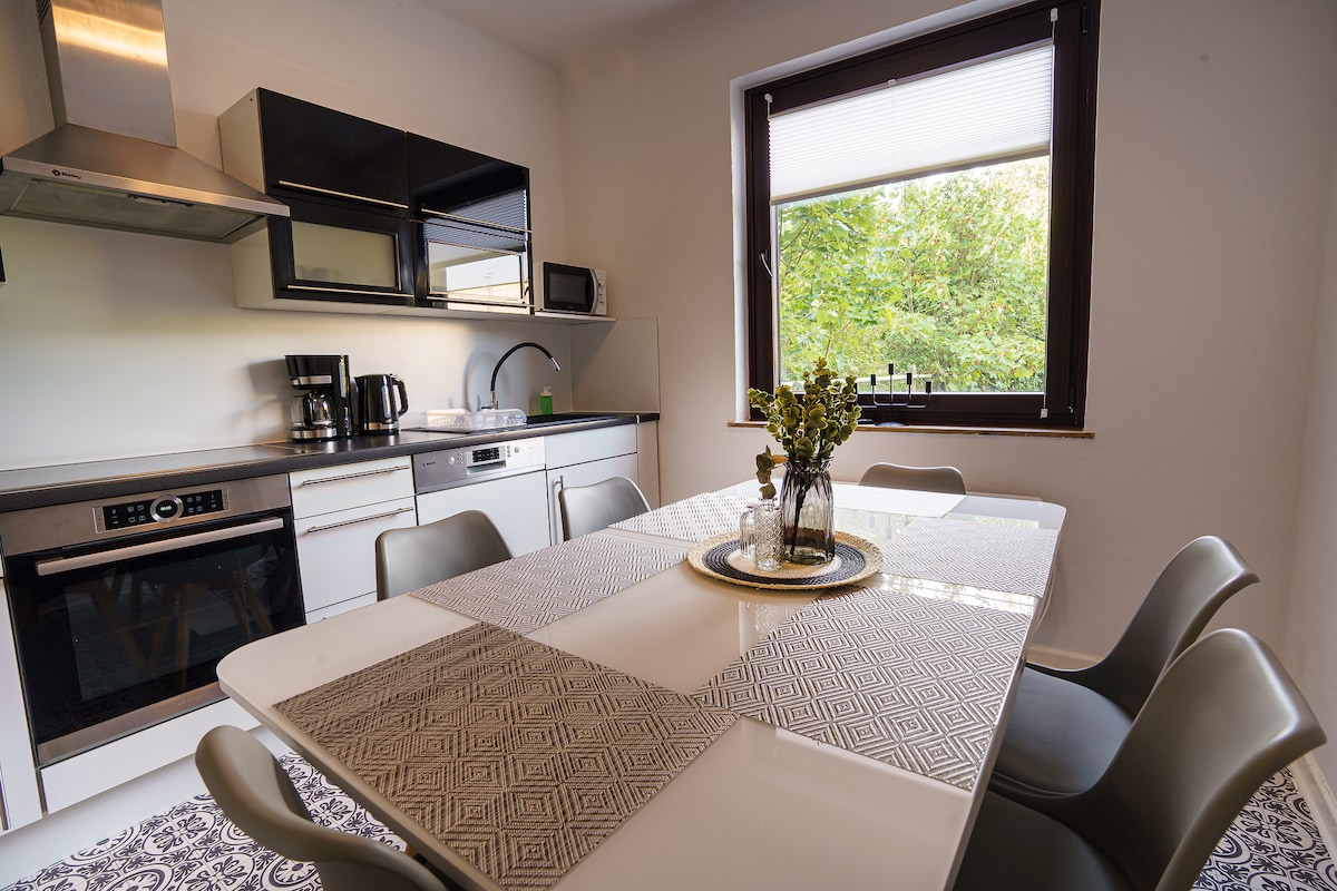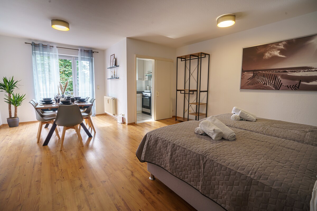 Welcome to our modern and stylish 2-room flat with 5 beds, own kitchen and good parking facilities . Enjoy your morning coffee on one of the two balconies, accessible from every room. The location is perfect: quiet yet central in Stuhr, with quick access to Bremen city centre and the airport. Shopping facilities, restaurants and IKEA are nearby. Explore the ramparts along the Weser. The neighbourhood is wonderfully quiet.