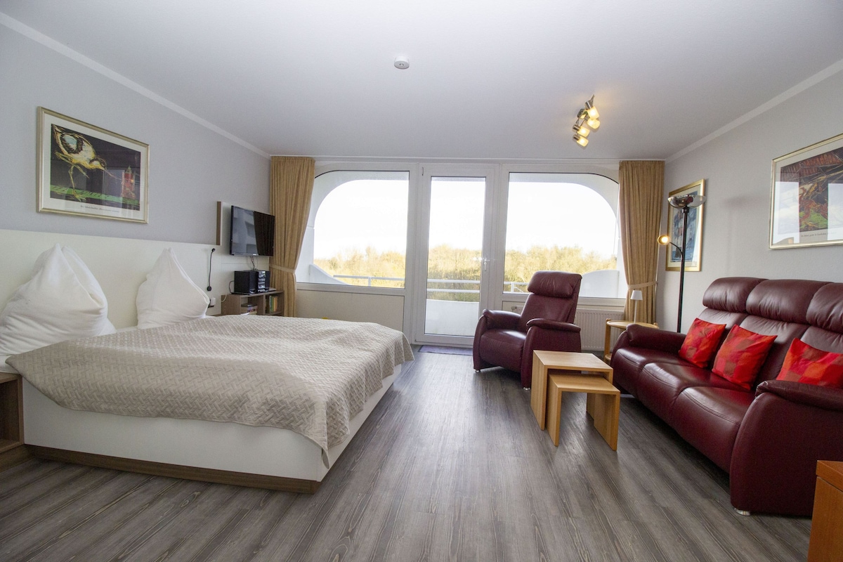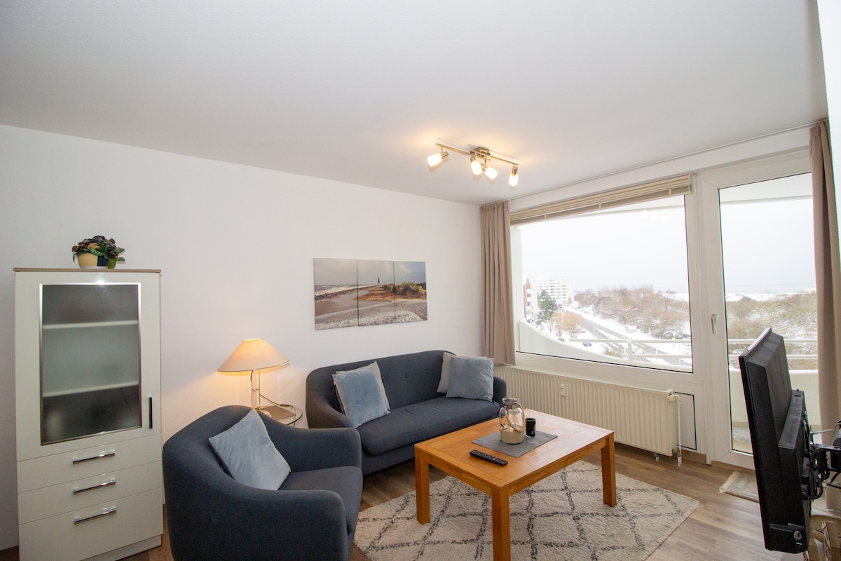 Das Appartement 218 bietet einen traumhaften Blick über die Seeschifffahrtsstraße. Das Apartment bietet sämtlichen Komfort für einen entspannten Urlaub mit Schwimmbad, Sauna und viel frischer Nordseeluft! Zum Schlafen steht Ihnen eine Nische mit Etagenbett im Flur und eine Schlafcouch im Wohnraum zur Verfügung. Die Küche ist mit Spülmaschine, Kaffeemaschine, 2-Platten-Herd, Minibackofen und Mikrowelle ausgestattet.