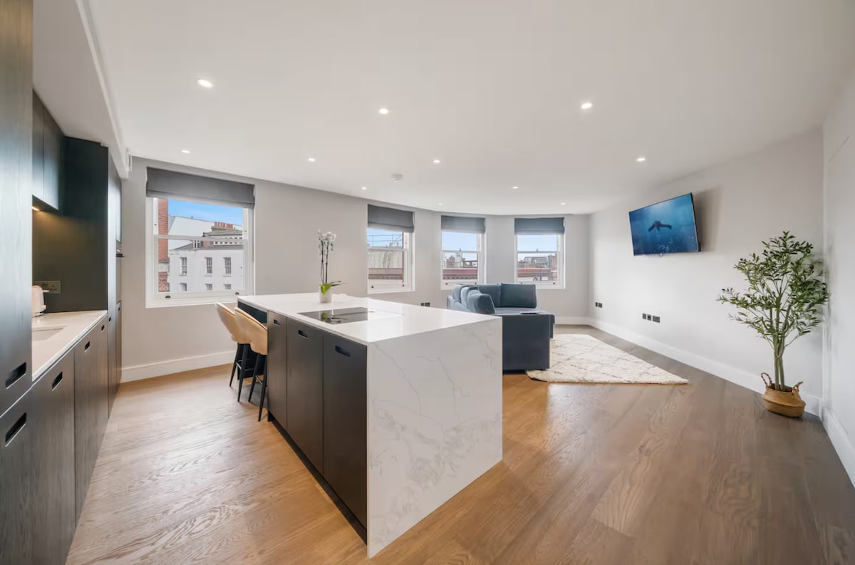📍 Unbeatable location just one minute from Hampstead Tube, surrounded by excellent restaurants and moments from Hampstead Heath, with Central London only minutes away. This exceptional, air-conditioned 2-bedroom, 2-bathroom apartment accommodates up to 6 guests in comfort. The property features king-size beds, a private entrance, refined interiors, sleek bathrooms, underfloor heating, and air conditioning throughout. Feel yourself home away from home.🏡
