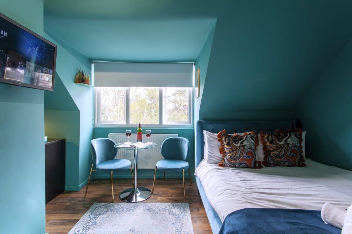 位于伦敦的时尚、宁静、蓝绿色单间公寓
