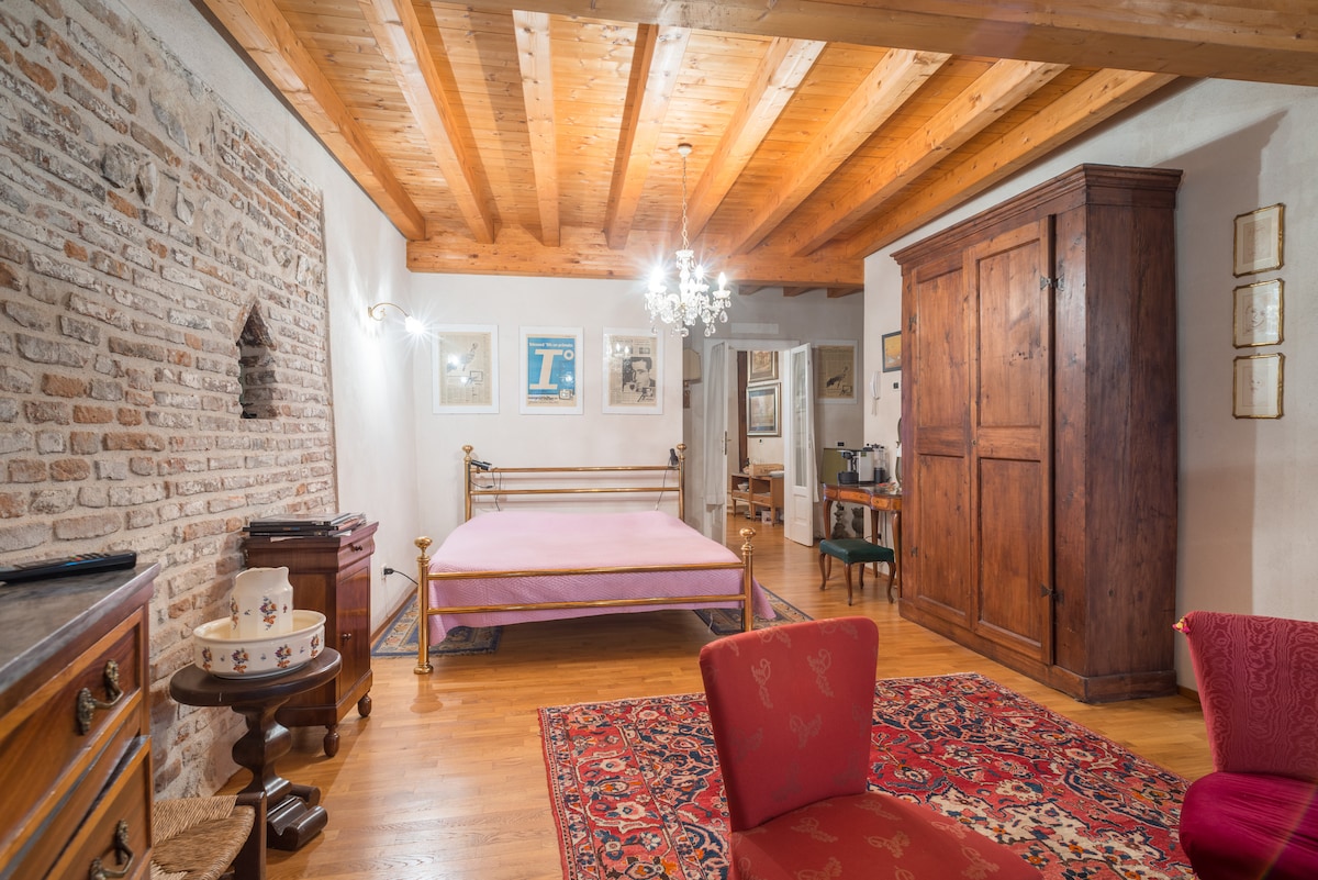 Un grande spazio aperto di 300mq, ricavato da un'antica scuderia del '700 facente parte dello storico Palazzo Secco Pastore della seconda metà del quattrocento. Loft con grandi vetrate che danno visuale sul portico (300 mq) e sul parco recintato da antiche mura. L'ho arredato con passione creando un mix di varie epoche, ottenendo così uno stile originale, accogliente e confortevole. Uno spazio volutamente fuori dal tempo ! Ideale se amate la vera campagna lombarda. Risiedo qui dal 1995.