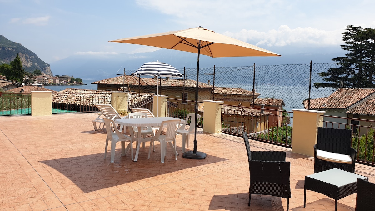 Appartamento di 54mq con accesso diretto a piscina e giardino, con vista panoramica sul Lago di Garda.Posizione superlativa e riservata. Utilizzo del giardino e della piscina, riservatezza e relax negli ampi spazi esterni. Costruzione moderna del 2015. Entrata privata e autonoma, ampio parcheggio. Pulizia rigorosa. Totale privacy. Ammessi animali di piccola taglia.