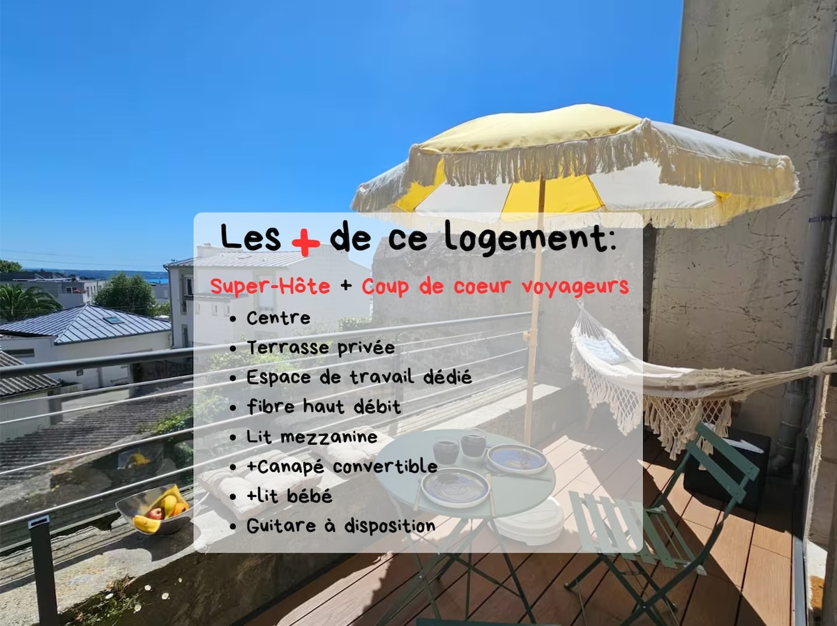 Welcome to your "Escale de Charme" in Brest. Located on the 6th floor, our light-filled apartment offers a unique view over the city rooftops and the bay. A true cocoon of calm and comfort from every perspective, it has been designed to make you feel right at home... Right in the heart of the city and fully renovated with style, the apartment is entirely equipped to ensure a most pleasant stay, whether for leisure or business travel.