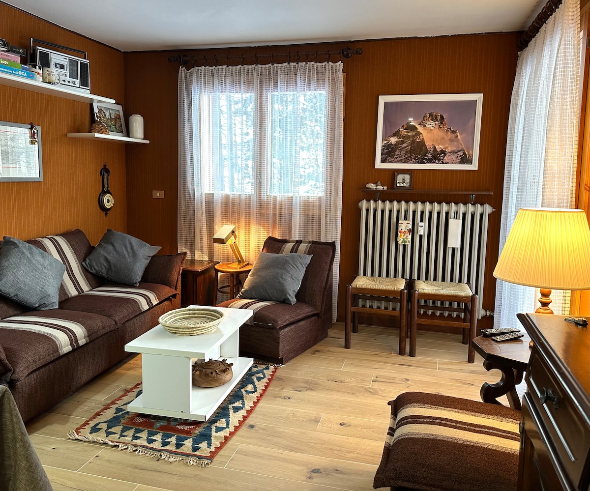 Cozy apartment in the town center, with a ski room and private garage. 100 meters from the Cretaz chairlift, ticket office, ski schools, ice rink, and children's play area. The shops, bars, and restaurants are just around the corner. A short walk from the golf club, tennis courts, and Nordic ski trail. The apartment is located on the mezzanine floor and overlooks the private communal garden with views of the Grandes Murailles mountain range and the Matterhorn, in a quiet and peaceful setting.